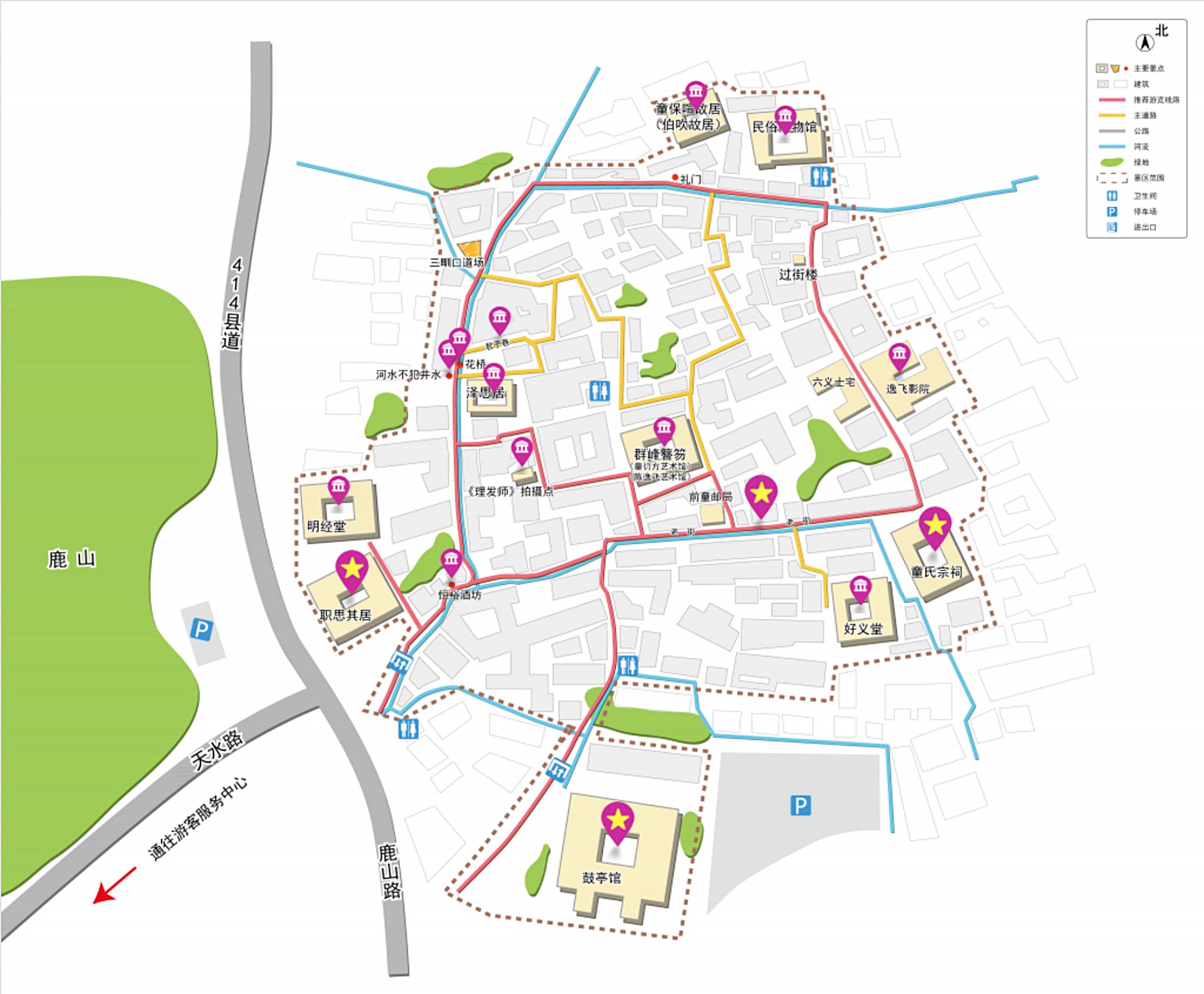 村内布局着黛青瓦粉白墙的道地(四合院)157座,集砖雕、木雕、石雕于一体,显示了"五匠之乡"的独特风采。还有古建筑门窗匾额上的一首首诗词,一篇篇家训和祈盼吉祥的话语,无不反映了浙东民居深空邃的文化韵味和昔日的繁华大粗族群落。景区内可供游览的有职思其居、明经堂、泽思居、上堂屋、群峰簪笏、好义堂、童氏宗祠等完好古宅和老街、民俗博物馆、中国第一鼓亭主题馆等景观。