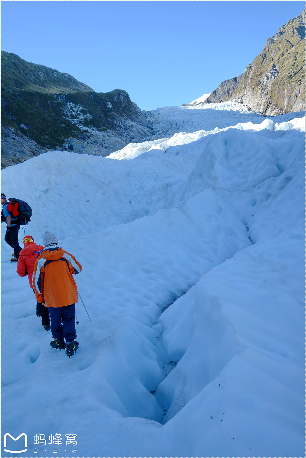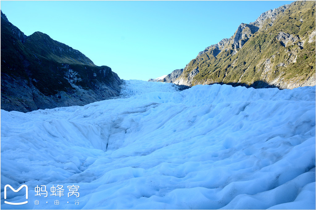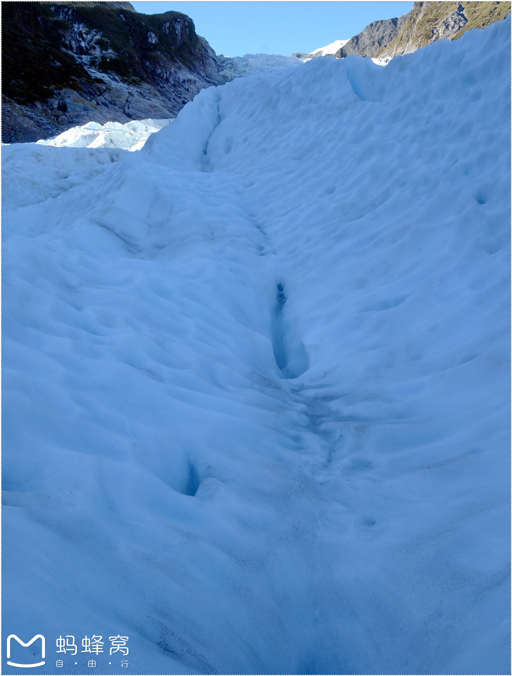 福克斯冰川沿着南阿尓卑斯山脉南麓淌下,13公里冰川线最高海拔2600米,而最低海拔只有300米,给福尔克斯冰川补充“冰块”就是南阿尓卑斯山的四条高山冰川,每年都会累积大约30米深的积雪注入。冰川上可以看到令人无限惊叹的冰缝,冰洞、冰拱、冰窟窿、冰隧道等景观。