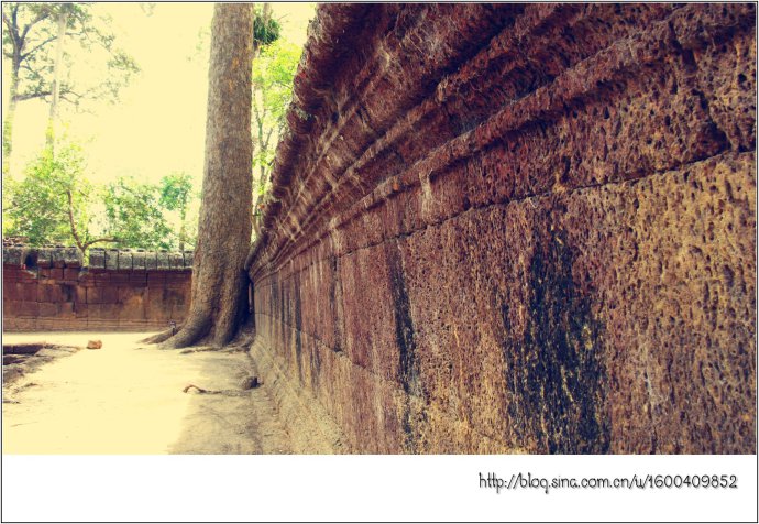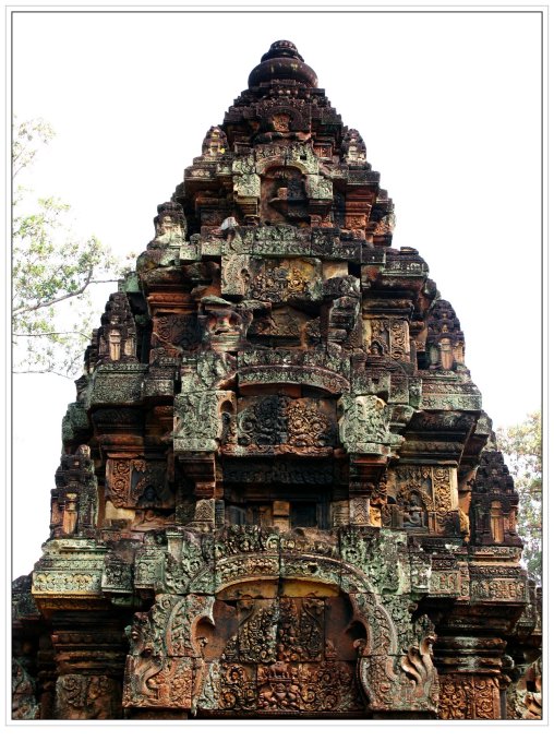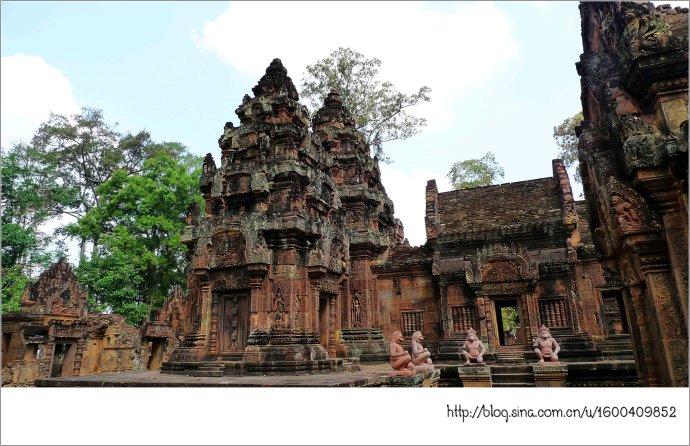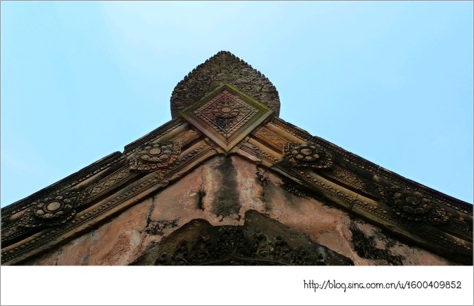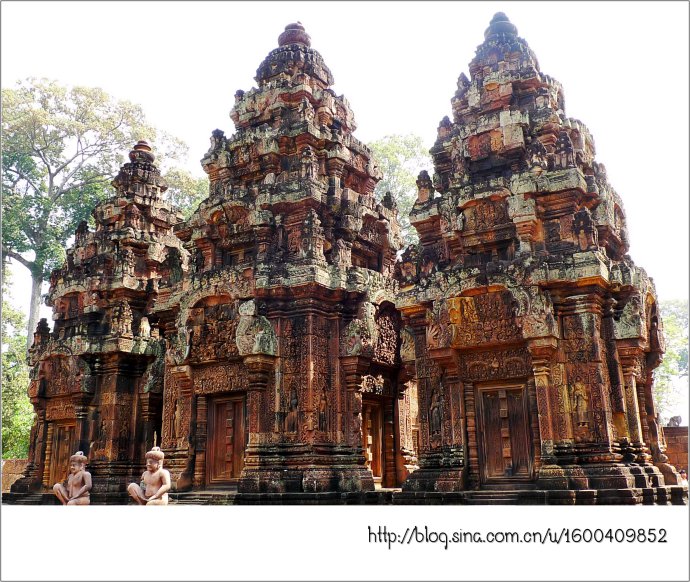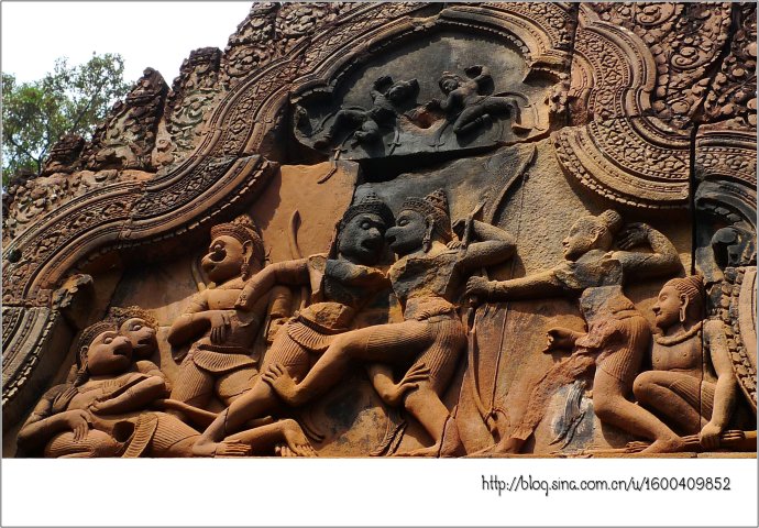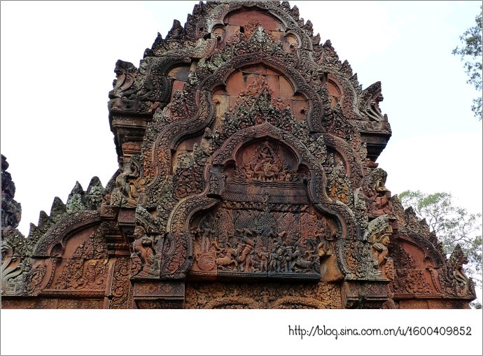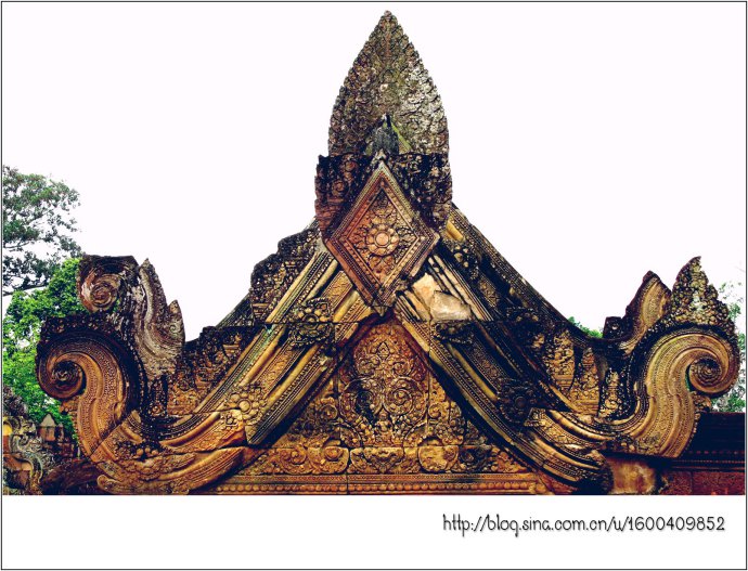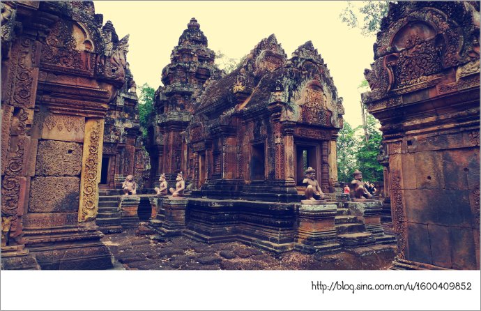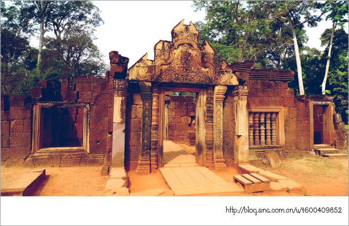 女王宫由朱色砂岩构成,它那奇妙的红色犹如施了粉黛的女儿,而她那别致剔透的浮雕则犹如女儿穿上了华服,卷起的屋檐犹如女儿戴了王冠,这不是一个美丽典雅、别有韵味的女王吗?