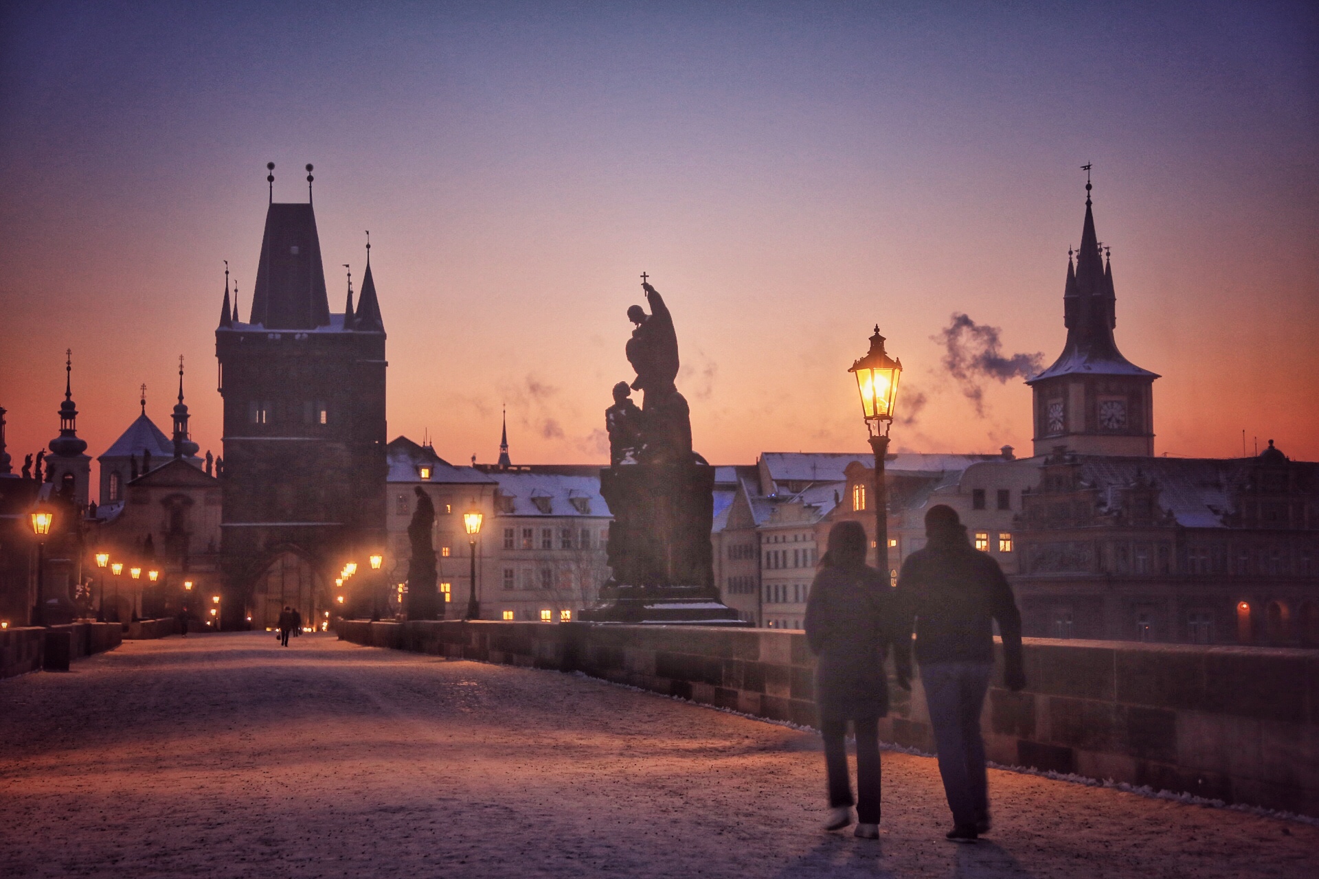 据说相爱的两人牵手走过布拉格所有的桥,爱情便能长久。可是布拉格有好多好多的桥呀,多到两个人一辈子都走不完一样。他们是不是担心一天之内走不完那么多各式各样的老桥,所以特意早起,无惧寒冷?