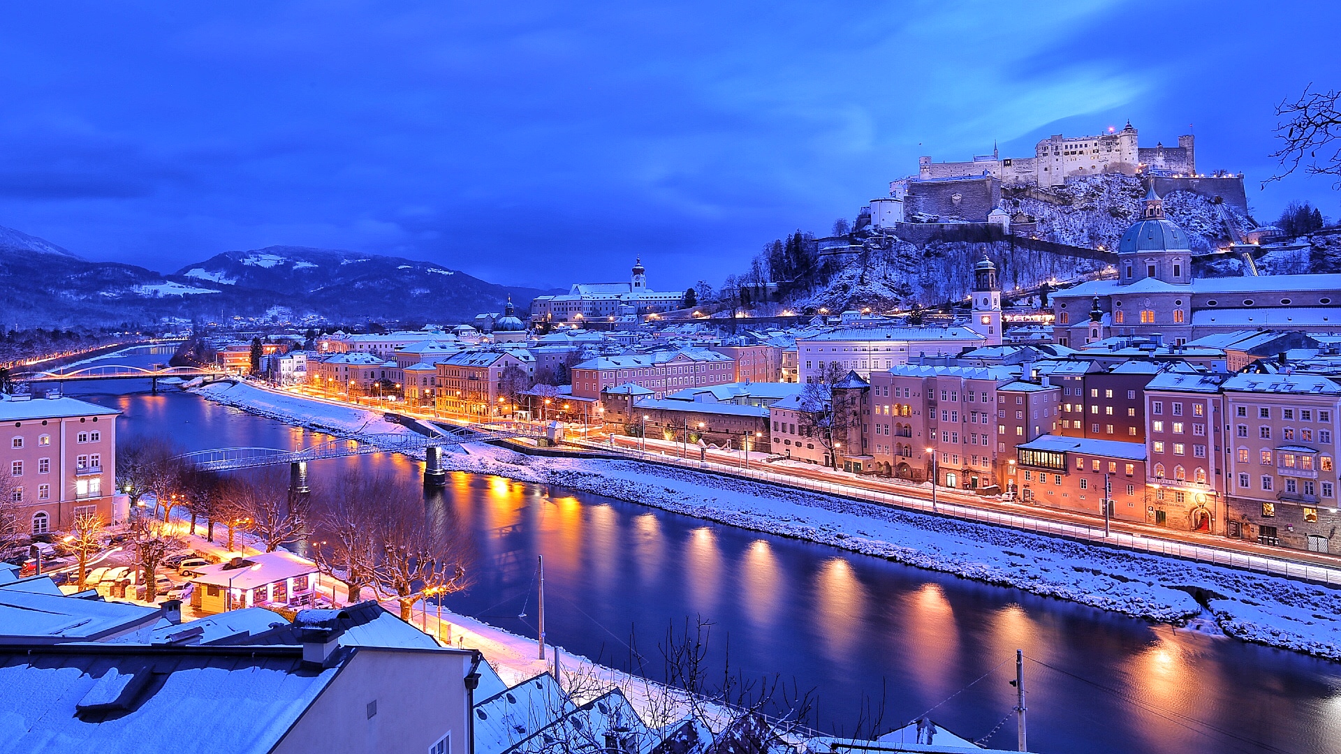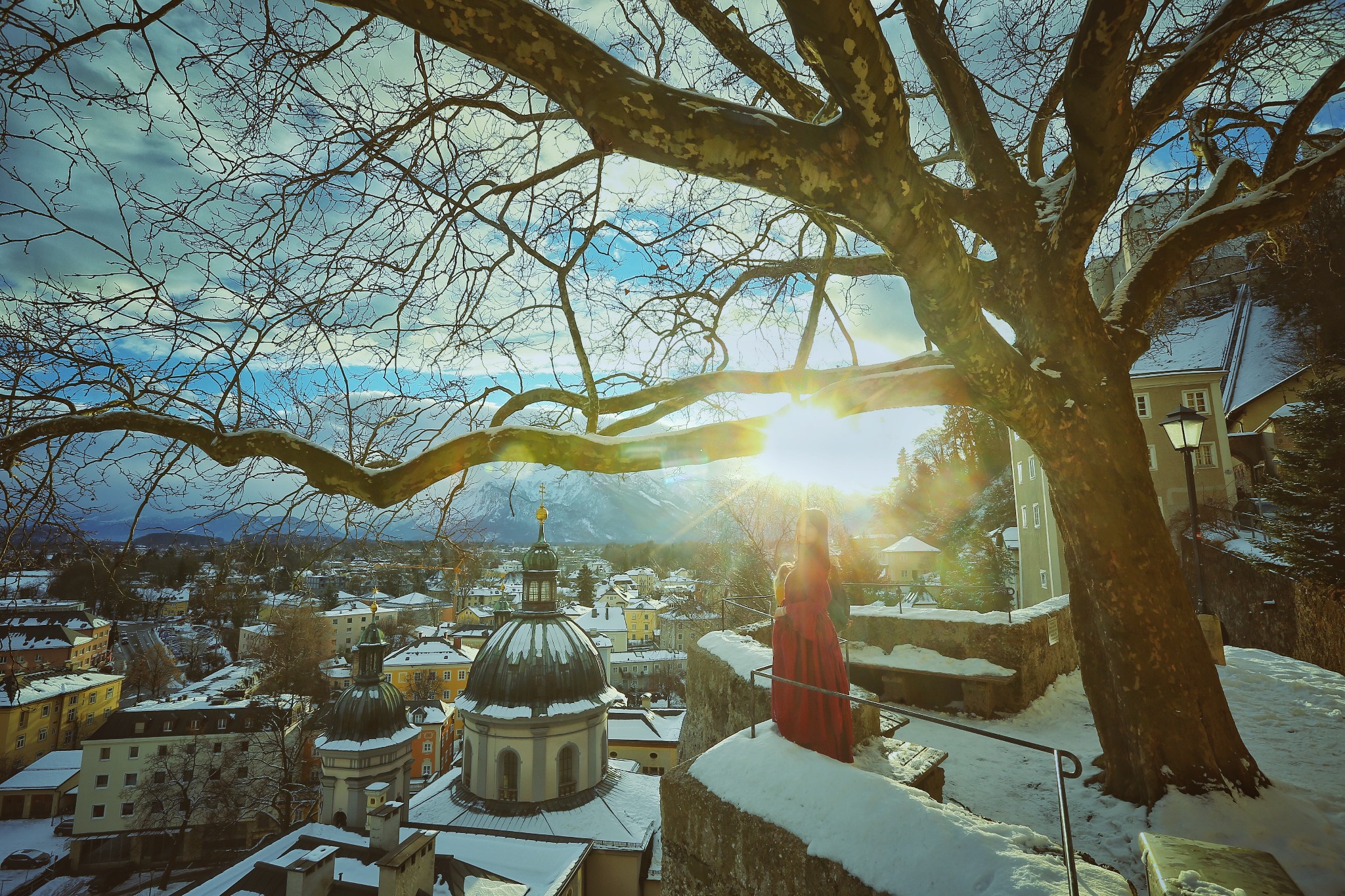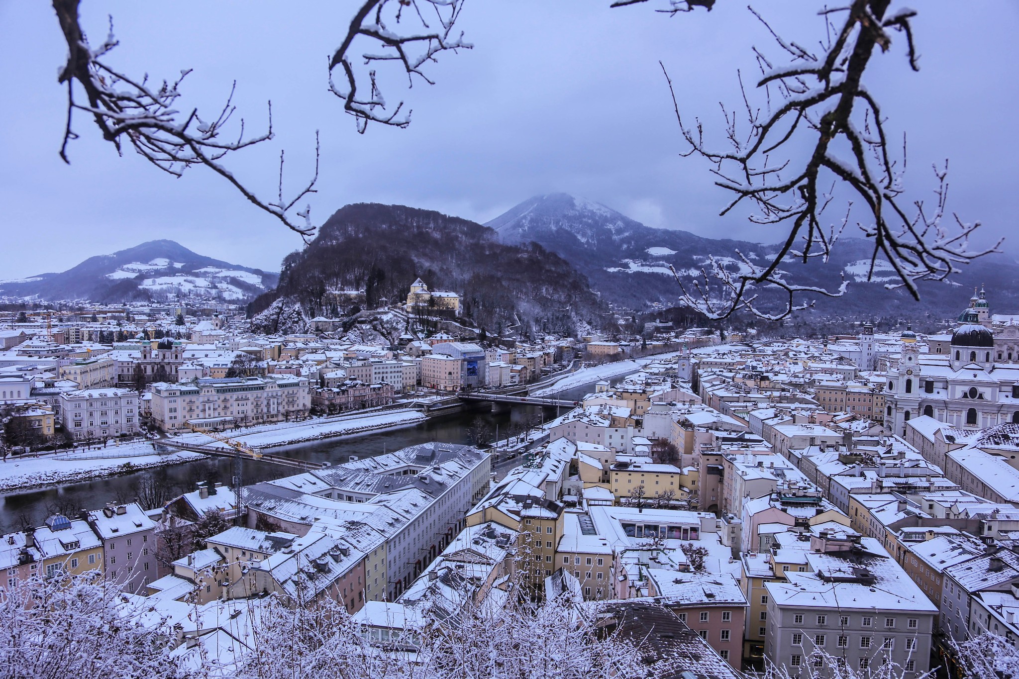 在雪后初霁的萨尔兹堡俯瞰城中的车水马龙,
