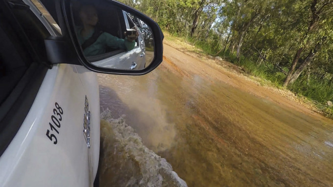 不在此处逗留, 车子立即向国家公园的深处开去。车开着开着硬路不见了,红土尘路显露了出来,这条400多公里的尘路在雨季里是不开放的,就在两天之前这条路才正式开放。 跳下车去把每一个车胎的气压都减到30,再回到车上小心翼翼的开着, 没一会儿,一条溪流不止的小河竟然挡在我面前….