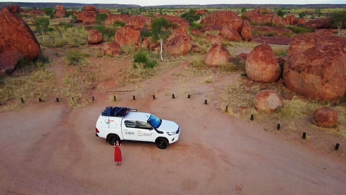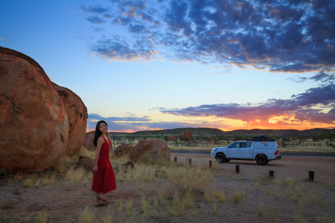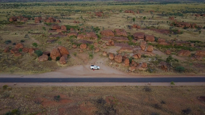 这片荒漠旁边有一个很特别的地方叫Devils Marble,这里也是老公最感兴趣的地方, 他要我一定要用无人机认真的拍几条视频。 Devils Marble,这名字起的非常贴切, 我也不知道中文叫什么,暂且叫它‘魔鬼神珠’吧。