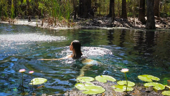 两天后终于到了Mataranka。Mataranka 是澳洲经典老片《We Are the Never Never》的拍摄地和原型。电影讲的就是英国早期开拓者来澳州这个"荒漠之地"开辟新家园的故事。这里是一片很大的沙漠绿洲, 这里有许多沙漠峡谷,河水充沛丰盈在峡谷中静静流淌。 更神奇的是这里有一个温泉,清澈的泉水从地下涌出,全年恒温34度。