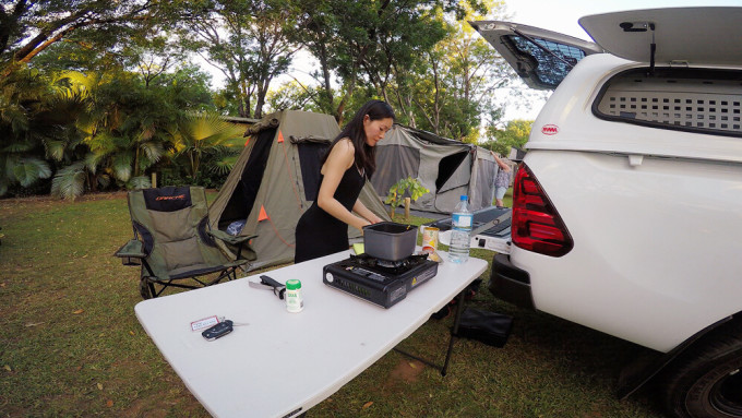 撑起庞然大物的帐篷时我已经快累倒虚脱了,后悔没有带我轻巧的单人帐篷。 这辆车的标配是一个可以睡5个人的大帐篷, 撑完后只剩我坐在地上汗流浃背的喘着气。 打开车后面的照明灯准备做饭, 一大群小虫飞蛾扑火一般涌过来, 无奈只能关了灯摸着黑用煤气炉热了两只罐头胡乱当了晚饭。