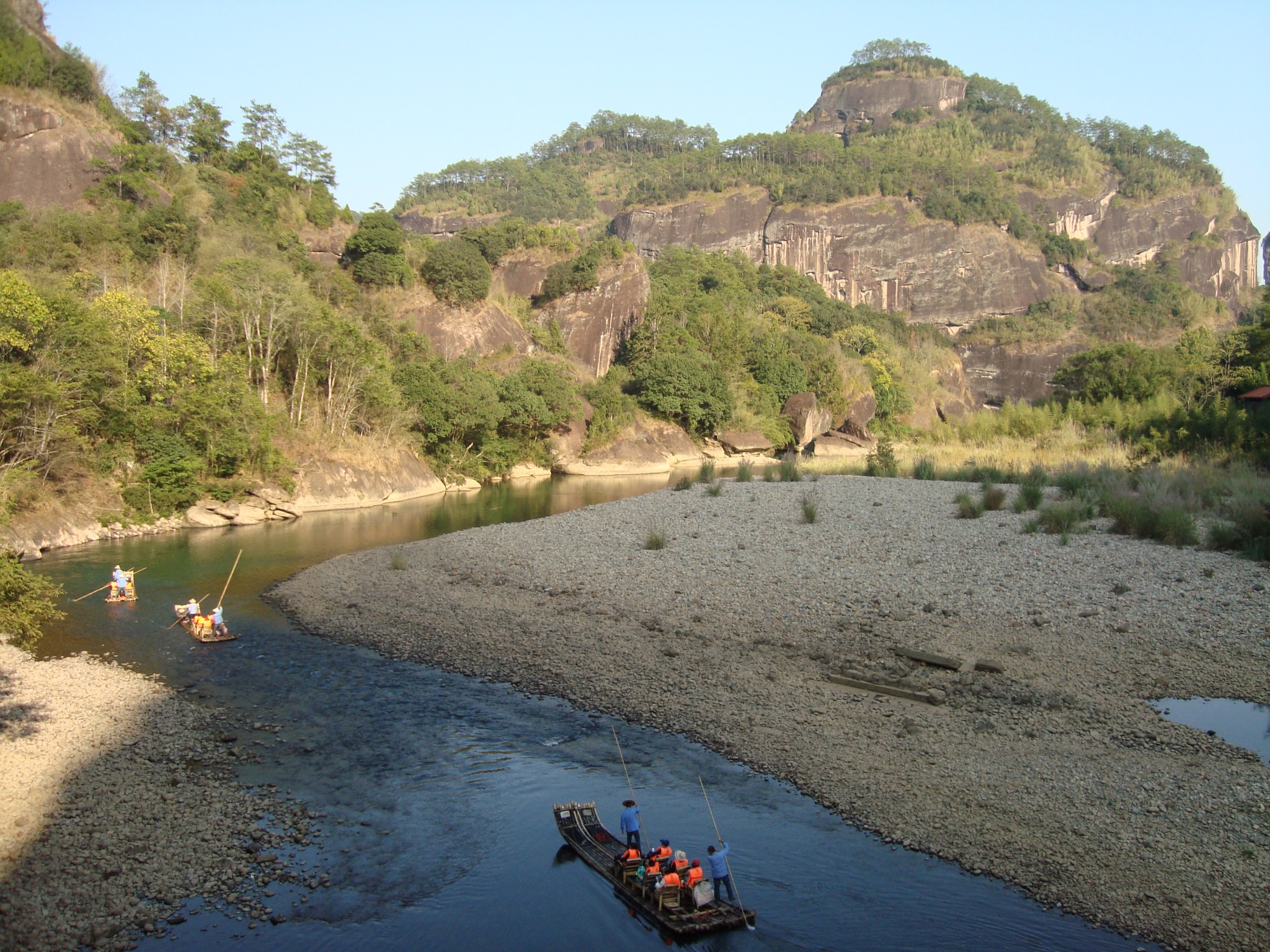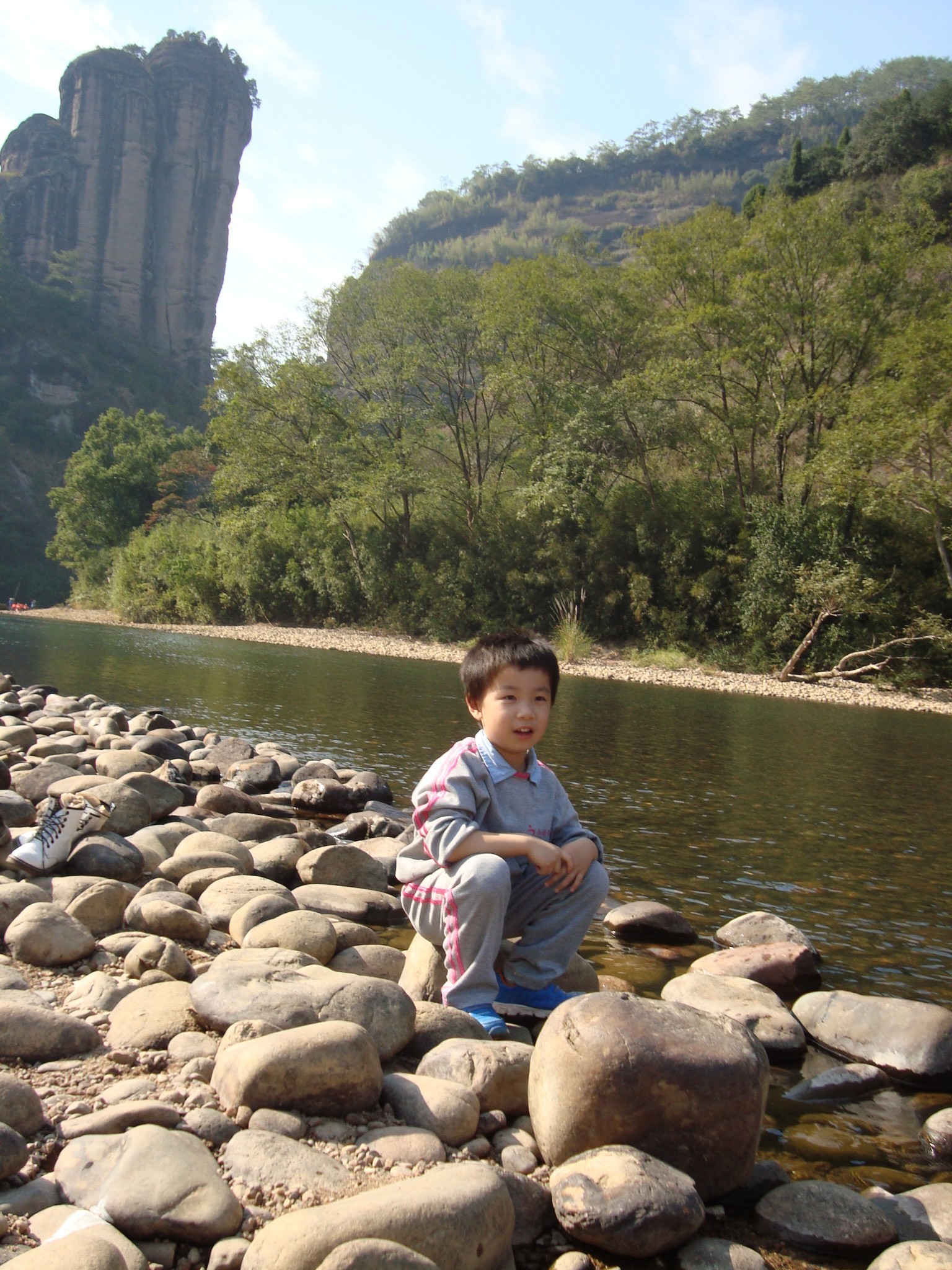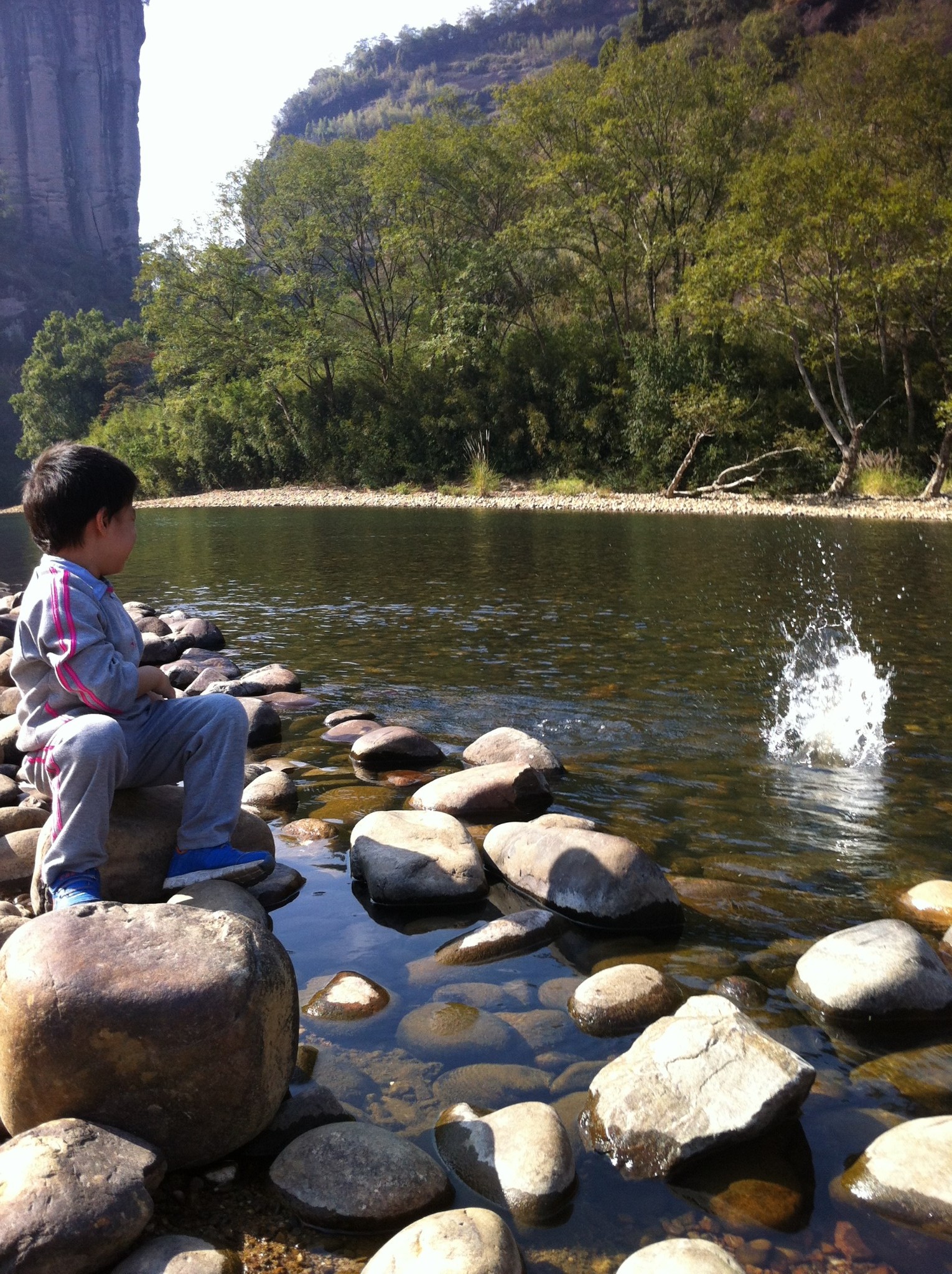 从一线天出来才两点不到,坐观光车在玉女峰景点下,路边有一处河滩风景很好,有人在此处拍婚纱照,九曲溪漂流由此经过,不远处就是玉女峰。小孩在此处玩耍很开心。