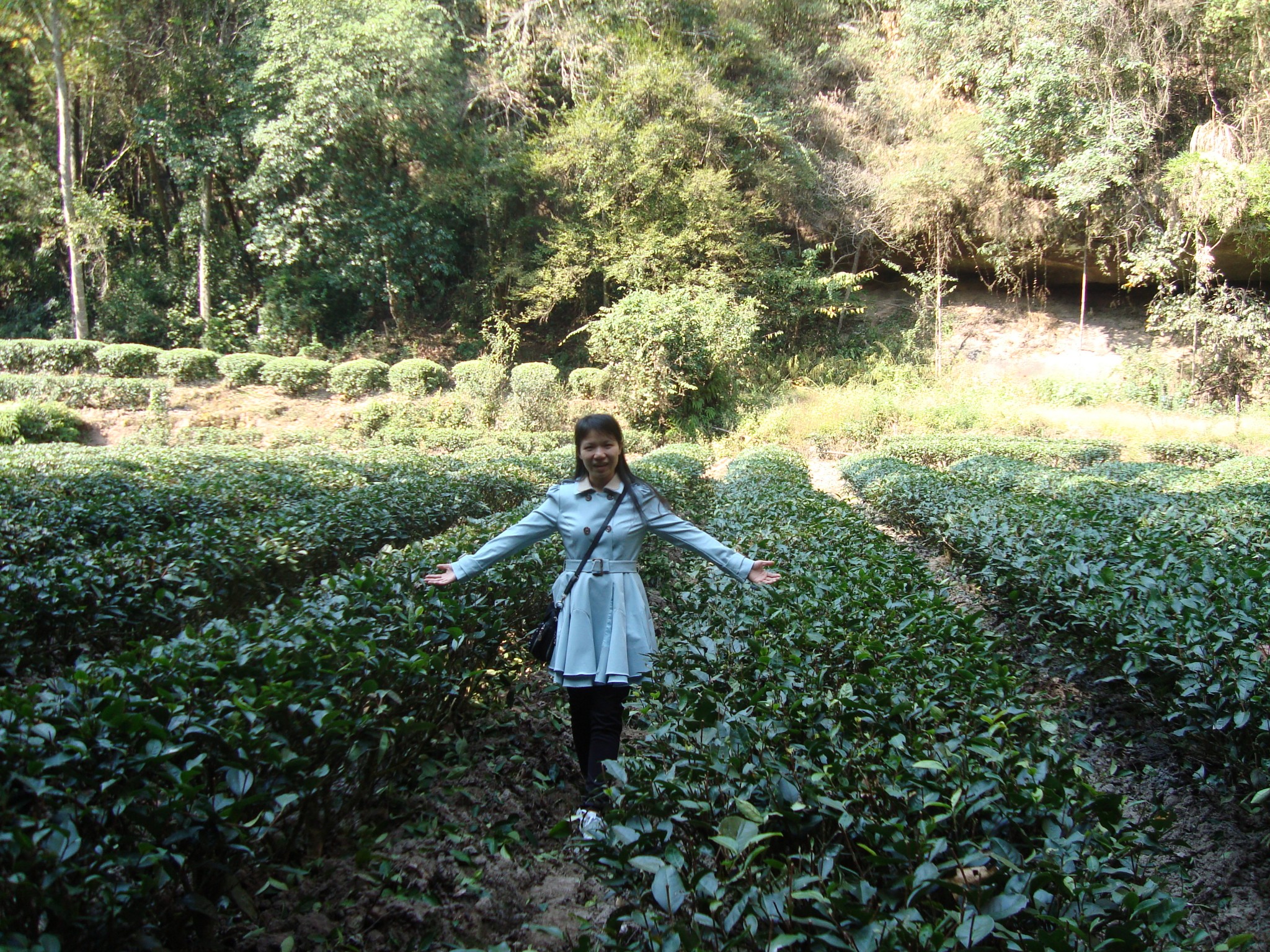 从虎啸岩下来,经过一片茶园,前往一线天景区。途中休息亭吃自带干粮。