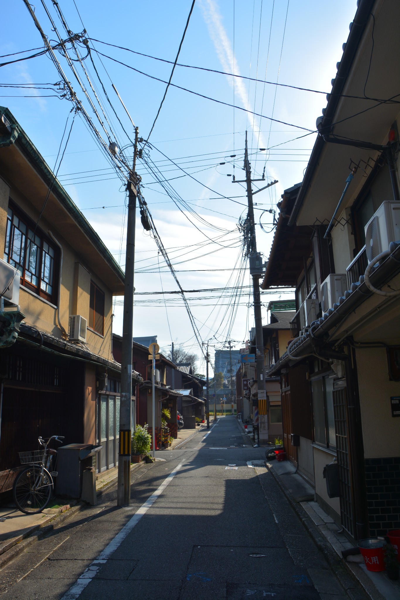 从京都站出来,拖着行李箱穿行在这座仿照长安建造的城市的小街小巷中,横平竖直,四平八稳,中规中矩。道路两侧的民居大多熄了灯,在静谧的夜里,城市已渐渐睡去,偶尔路过一间居酒屋或是咖啡馆,还亮着昏暗的灯光,仅仅只是照亮门前一小片地方。天空又飘起迷蒙的小雨,踩过临时聚成的小水洼,溅湿裤脚,再拐过一个巷口,来到大马路上,预定的旅馆就在眼前。