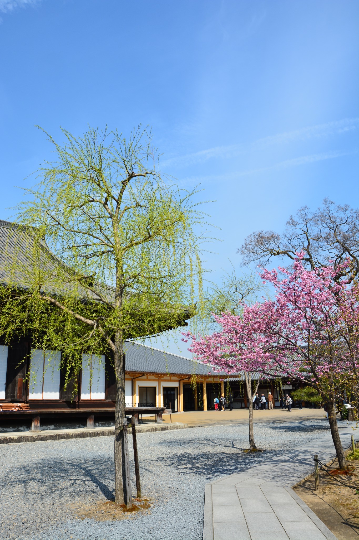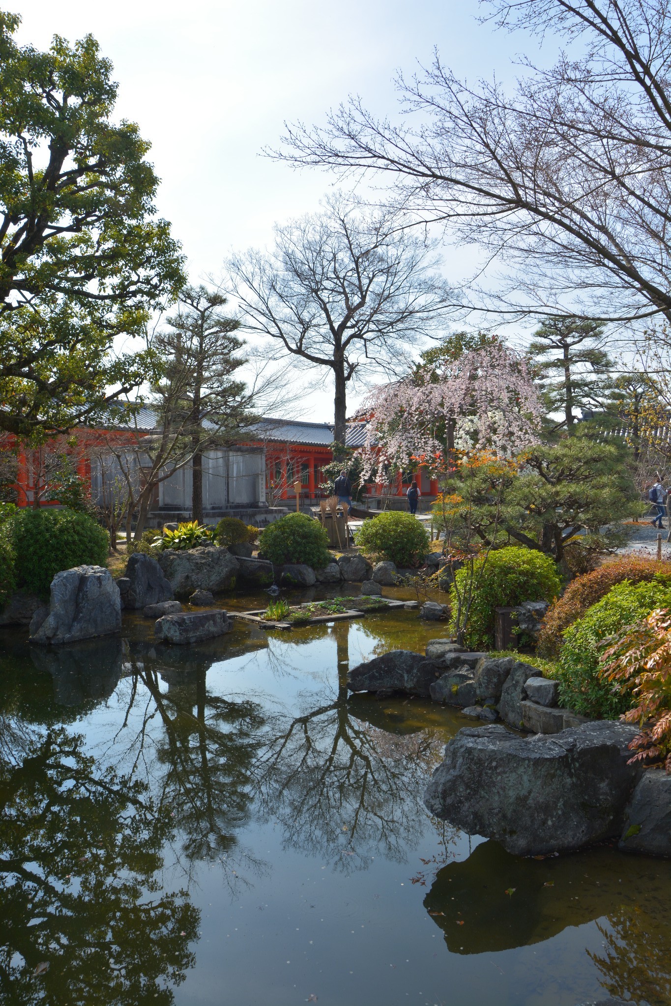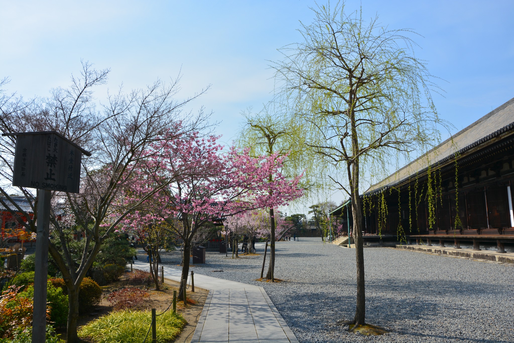 三十三间堂外有座小小的园林,却是樱花、柳树、松柏、凉亭、假山、石塔统统聚齐,正是麻雀虽小,五脏俱全。沿着池塘侧畔的碎石路绕上半圈,风景亦是极好。