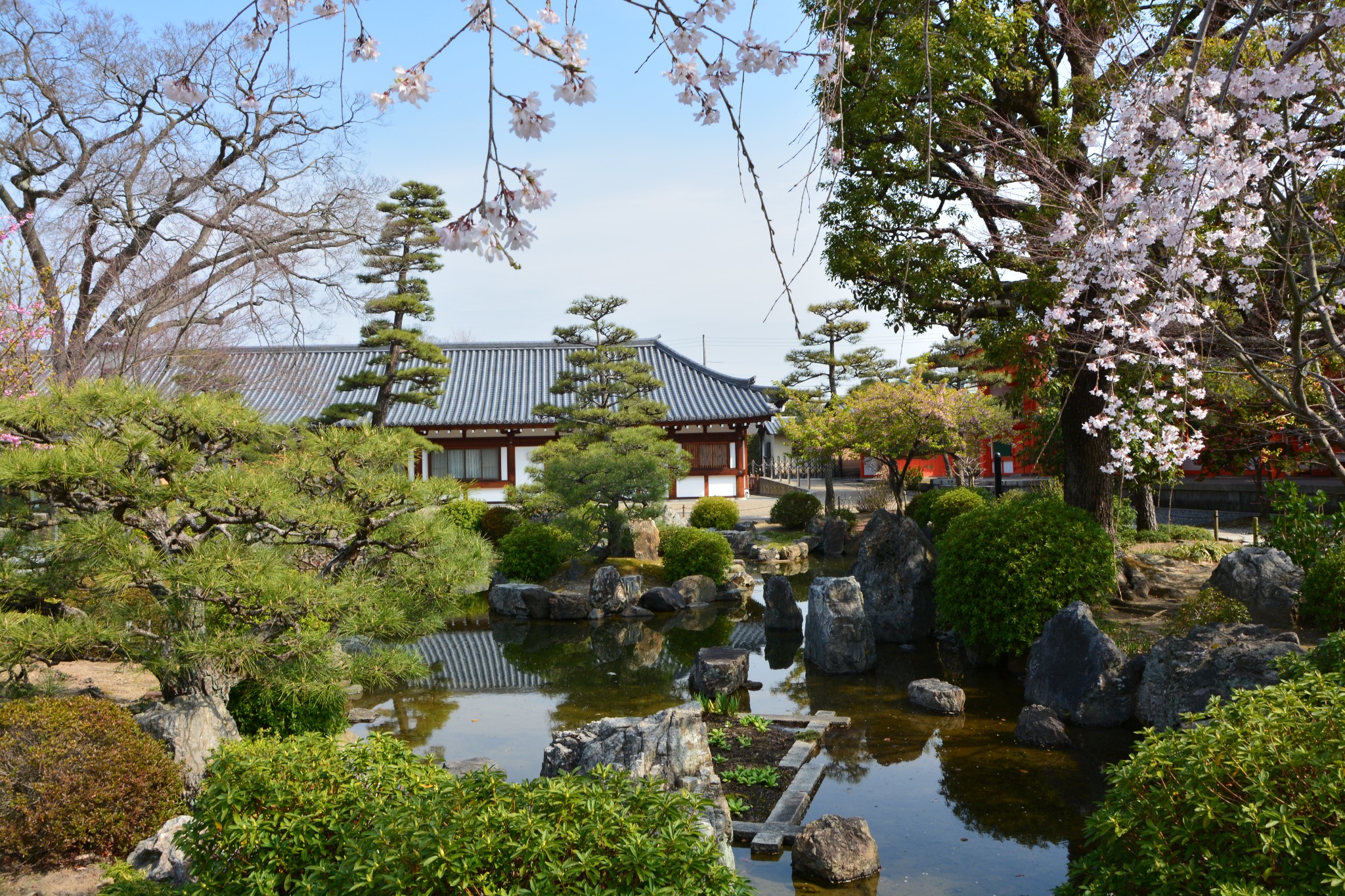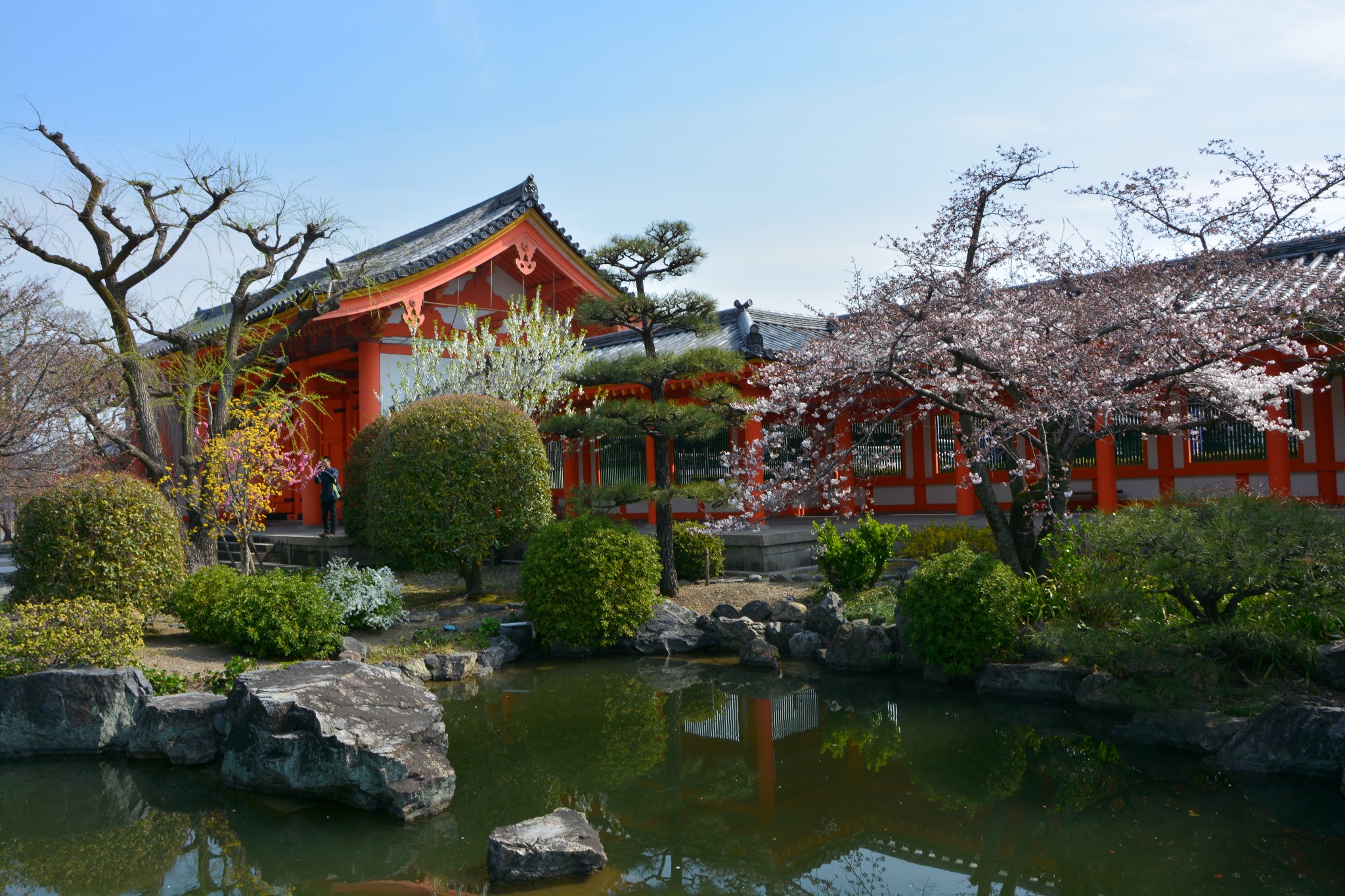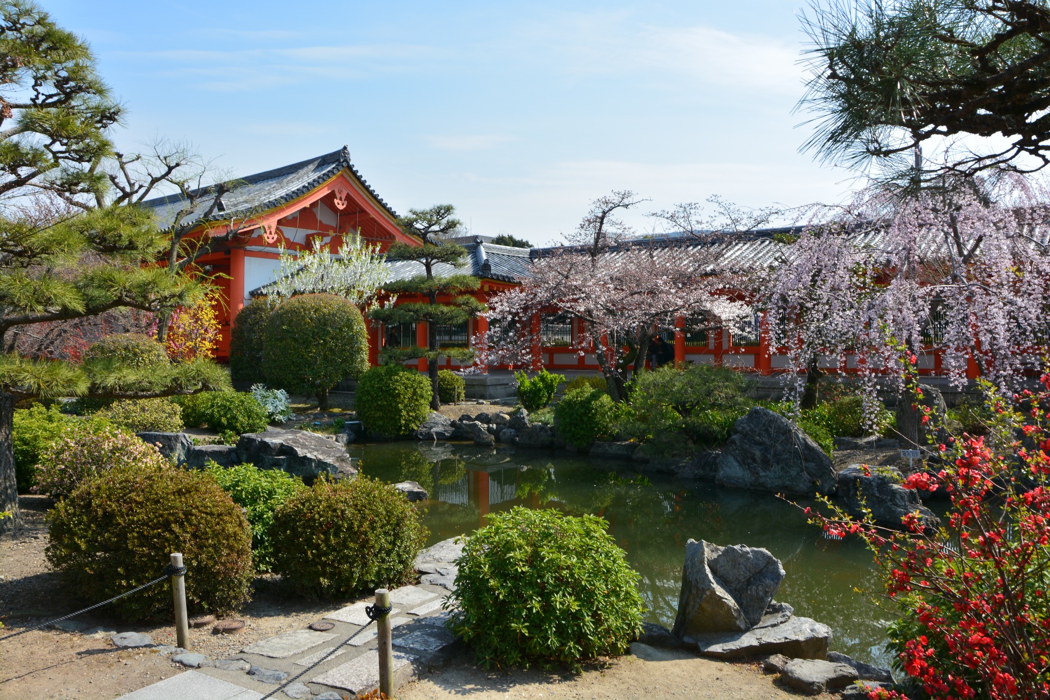 三十三间堂外有座小小的园林,却是樱花、柳树、松柏、凉亭、假山、石塔统统聚齐,正是麻雀虽小,五脏俱全。沿着池塘侧畔的碎石路绕上半圈,风景亦是极好。