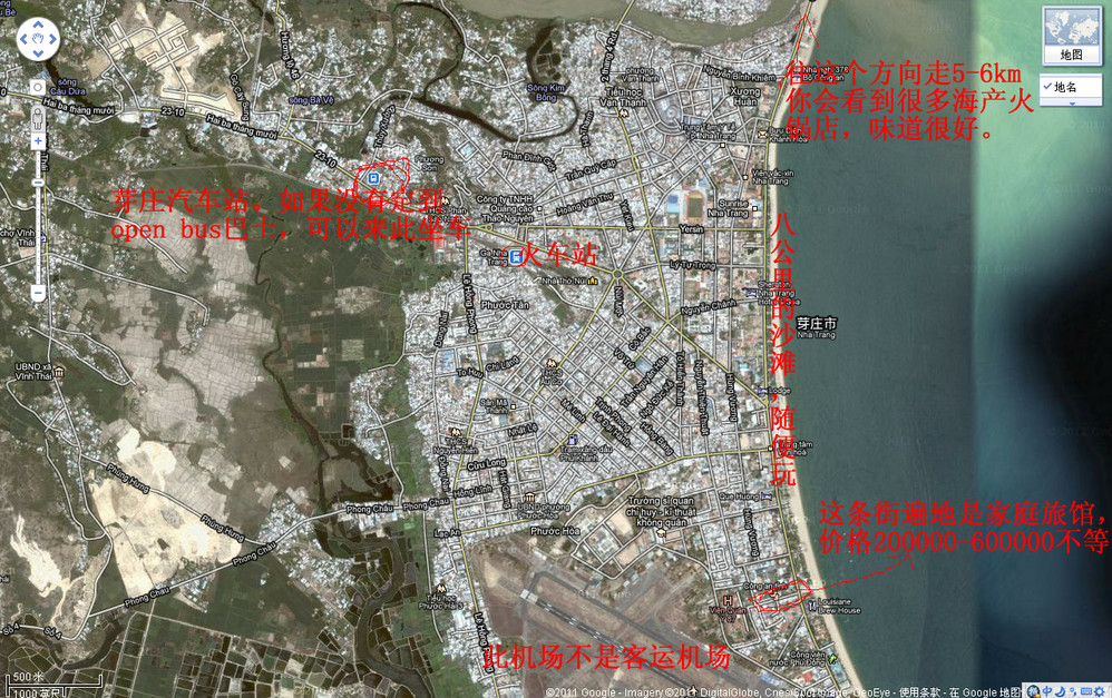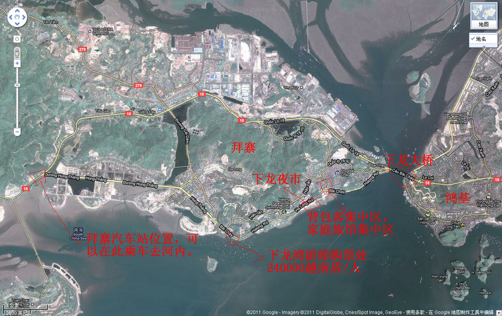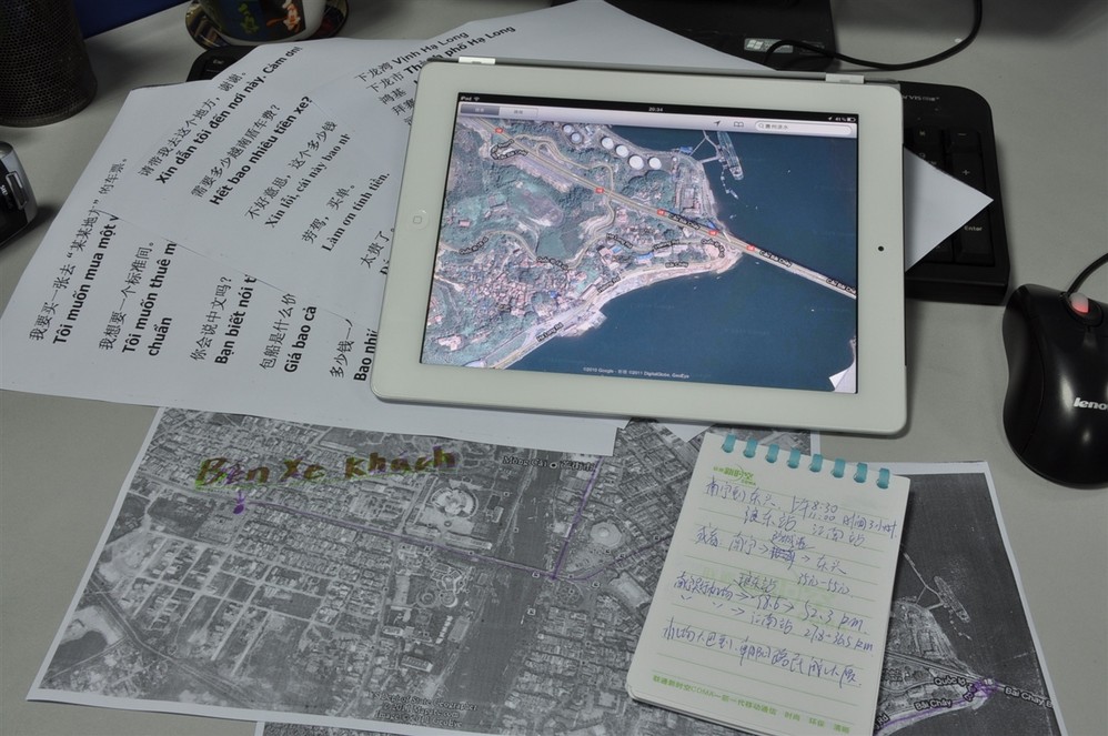 15:00 (这个时间是越南 时间,入境后请将手表倒退一小时。)在芒街 口岸招来一个摩的,掏出事先打印好的地图去芒街 汽车站,车费20000越南 盾,芒街 的摩的似乎很友好,不宰人。到芒街 汽车站后,转了几个圈,拒绝了很多拉客仔(NO,thanks),终于看到了去拜寨(下龙市 分为鸿基和拜寨,拜寨才是背包客集中以及下龙湾 游船出海处,所以一定要坐去拜寨的车)的小巴车。上车后发现ipad2上还有信号(中国 联通),马上打开谷歌地图,指给司机看我的下车地点(过下龙大桥后马上下车)。