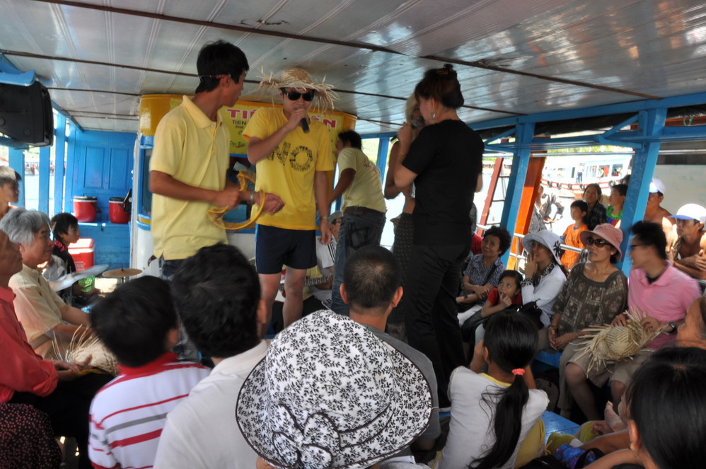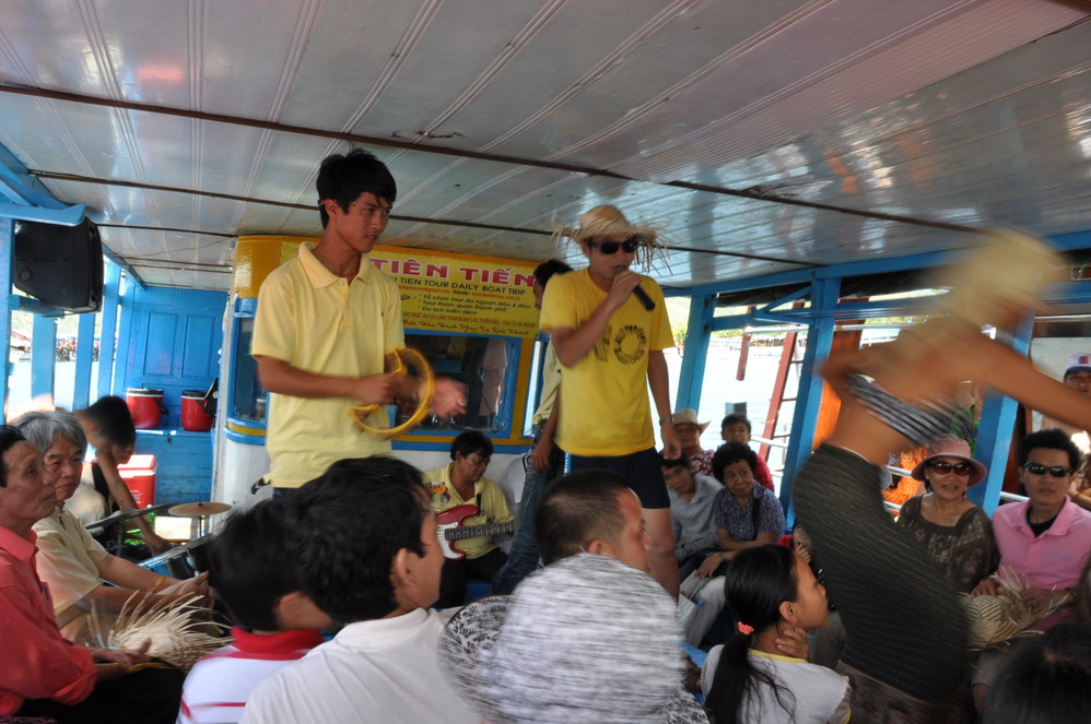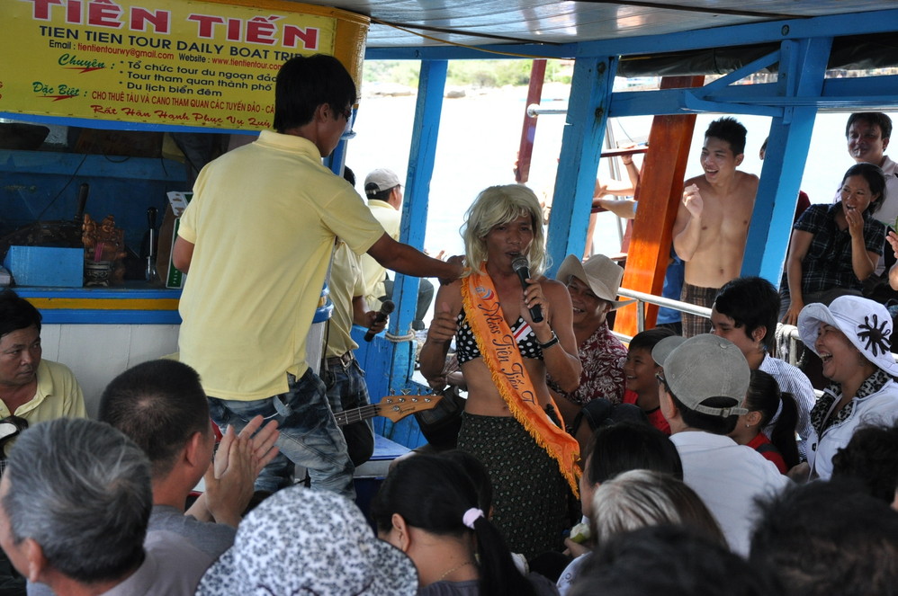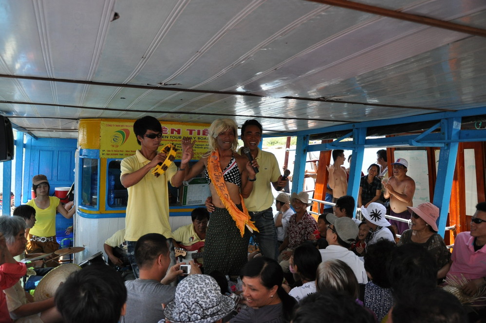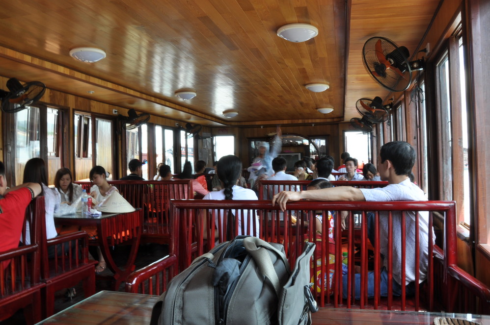 游船内。除了我全部是越南 人。物以类聚,所以我一个人坐了四个人的座位。