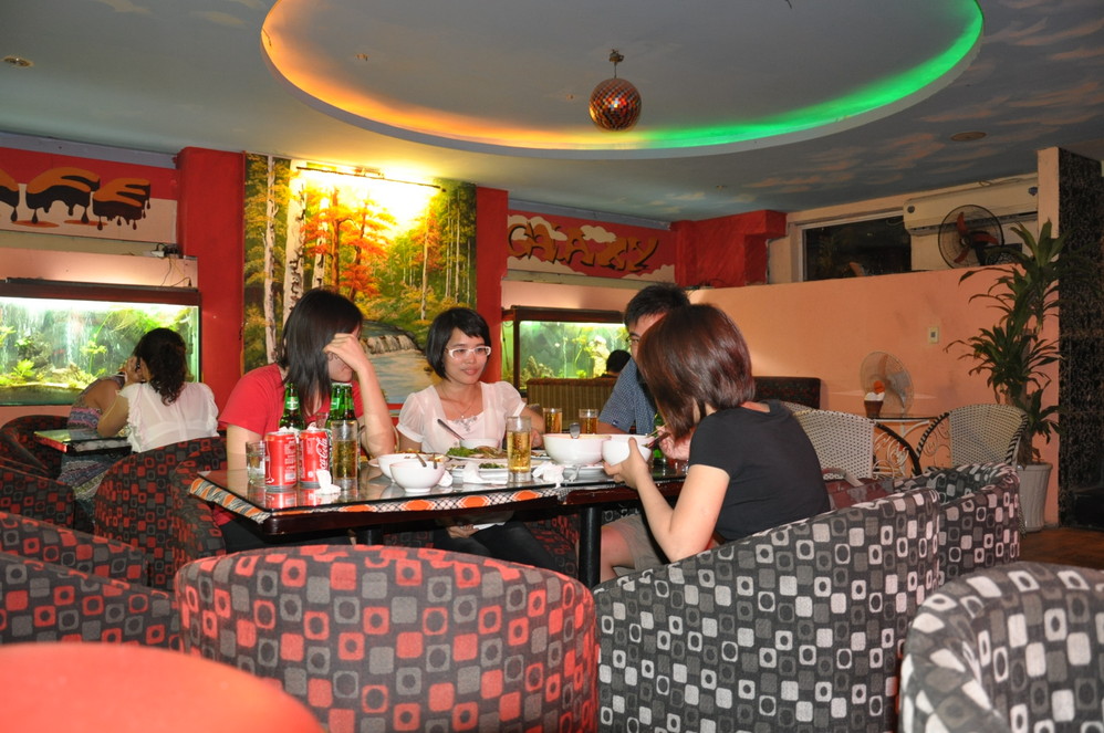 19:00 在学生村体育宾馆 负一层的咖啡厅请几个中国 留学生喝啤酒。(这是我为什么没去还剑湖 的原因)本来只请两个留学生吃饭,但是鉴于我比较热情,比较反客为主,最后拼了三张桌子,喝酒人数达到9人之多(男2女7)。我一个人就喝了15支啤酒(330毫升),买单时大家都不和我争,1270000越南 盾,相当于人民币400多。