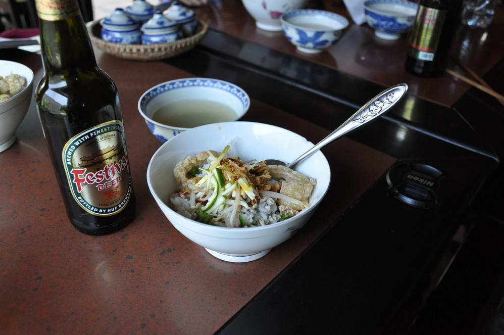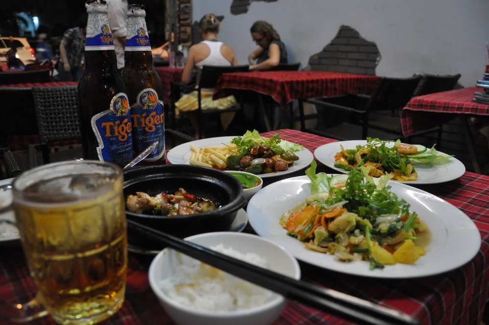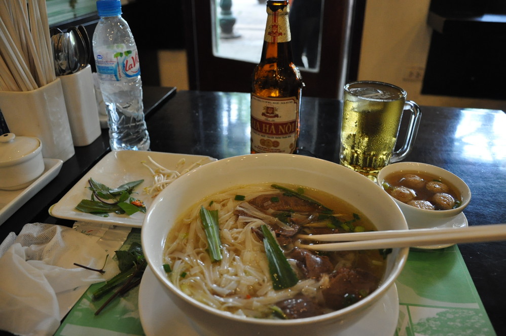 还剑湖 岸边的餐厅。里面的食客全部是西方人。我进来后终于有了个东方食客。河内 啤酒,非常好喝,不知是不是加了冰块的原因。嗯,越南 人喝啤酒都会在杯子里加 冰块,不管啤酒是冰了的还是没冰的。一碗牛肉粉,一碗牛肉丸子,一瓶bia ha noi,价格100000左右。不算贵了,在越南 ,粉比米饭贵多了。