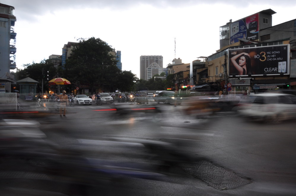 河内 ,中国 大使馆附近等待绿灯的摩托车流。当日未见到示威游行人群。