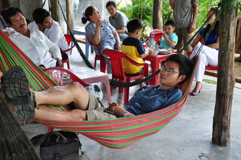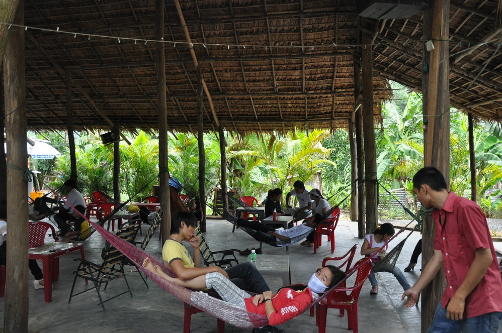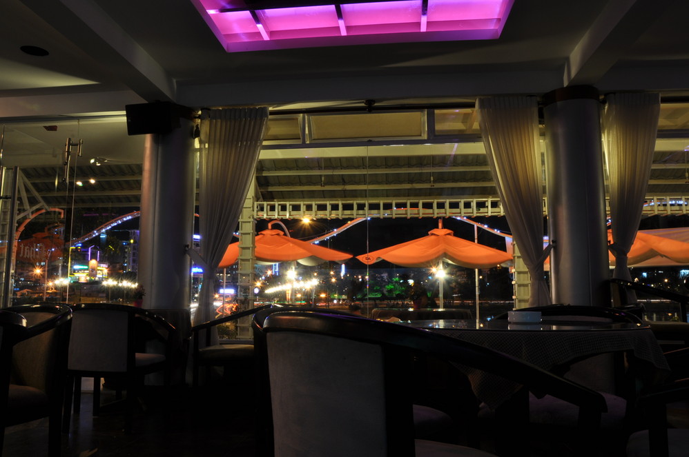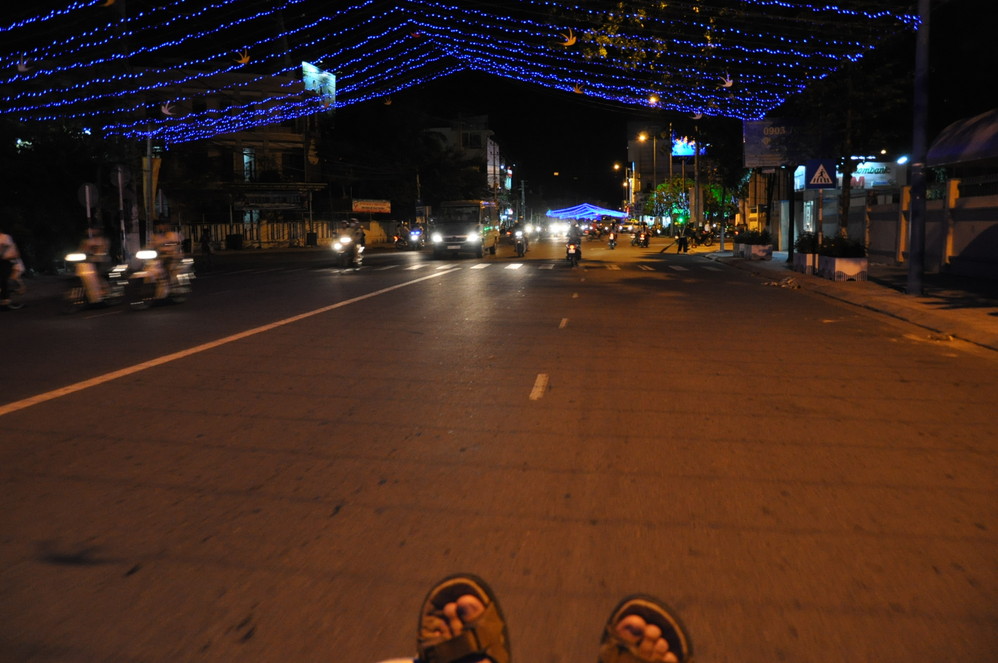 18:30 车行大约3.5小时后,抵达下龙大桥,如果是去拜寨背包客集中地区,那么最好过了下龙大桥就下车。下车后乘摩的20000元可到下图中背包客聚集处,然后随意找一家家庭旅馆,随意杀价,10-15美元即可入住。