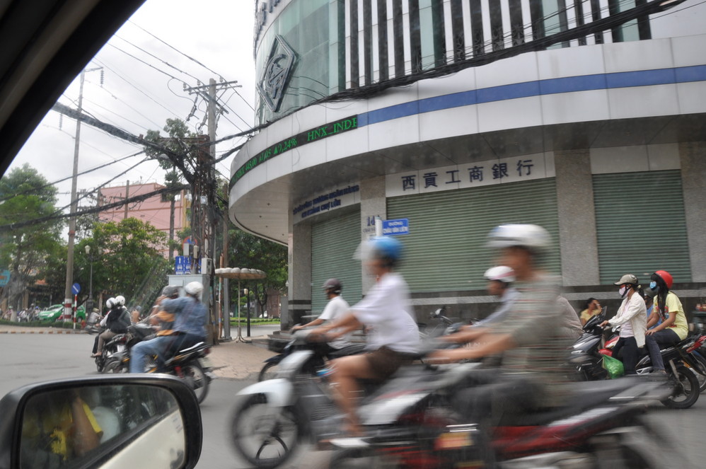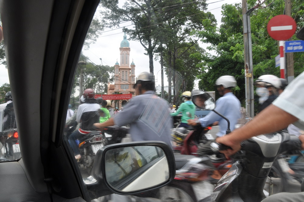 的士车窗外的摩托车流与教堂。司机告诉我胡志明的中国 领事馆已经被示威游行的越南 人包围了,我让他带我去拍几张照片,他说去不了,领事馆附近的街道已经被公安封锁了。