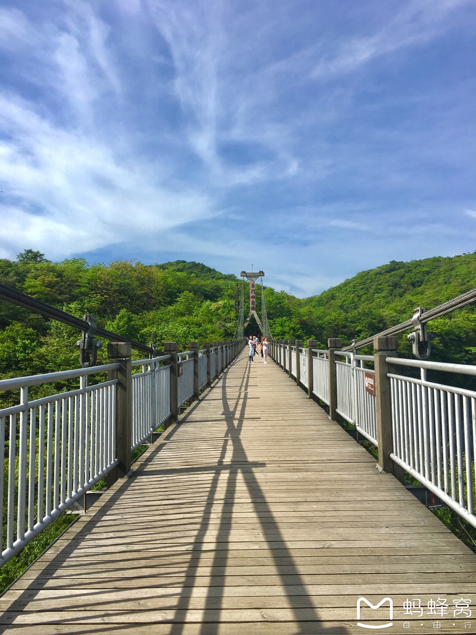 在栈道的完结处的两个悬崖之间有一条长160米的悬索吊桥,悬索桥