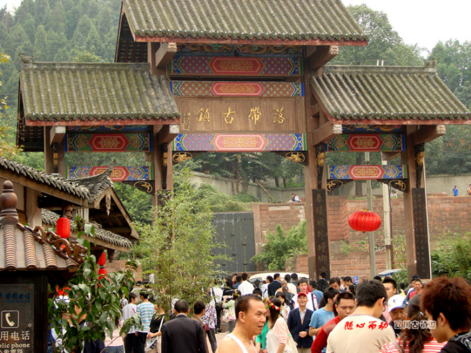 距成都20多公里,是成都市龙泉驿区的一个小镇,建于三国蜀汉时期,传说因蜀汉后主刘禅的玉带落入镇旁的八角井中而得名。清康熙年间,由于张献忠入川,与清军几经鏖战,双方伤亡惨重,人口严重流失,而四川地广人稀,土地肥沃,原有的劳动力急剧减少,清廷下谕鼓励人口较密的湖南、湖北、广东、江西等地的人入川,并实行优待政策,凡入川的男子补助白银八两,妇女补助白银四两。于是上述地区的人为了摆脱饥饱半年粮的窘况而入川。东起涪陵、重庆、内江等地,西至成都近郊地区的农民,不少都是康熙末年自南迁来的人。成都近郊的洛带镇是一个比较集中的移民点,其中广东客家人有2万多人,占全镇人数的9成,在洛带镇形成了独特的客家风俗和客家文化。洛带镇有中国西部客家第一镇之称。(可在成都新南门旅游集散中心乘中巴,票价5.5元,40多分钟就到了洛带镇。)