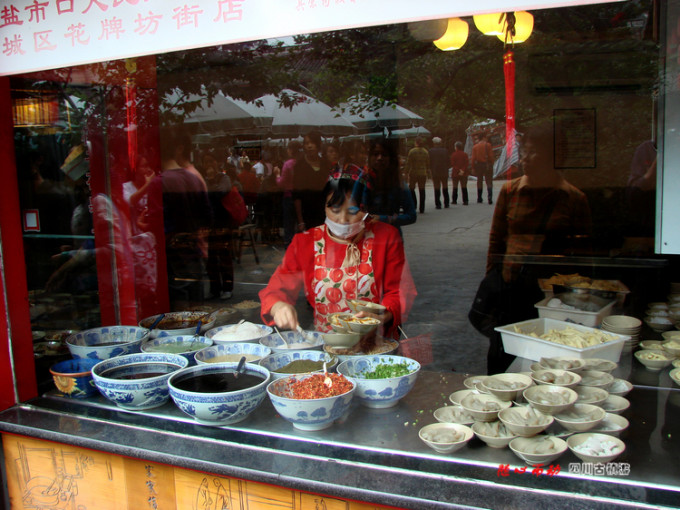 一对夫妻挑担卖石磨豆花沿街叫卖。在煦煦冉冉的人流中,给自己来一碗淋着红油,洒满脆黄豆、大头菜丁、馓子等作料的麻辣红油豆花,似乎更有味道。