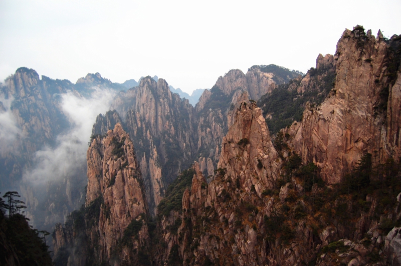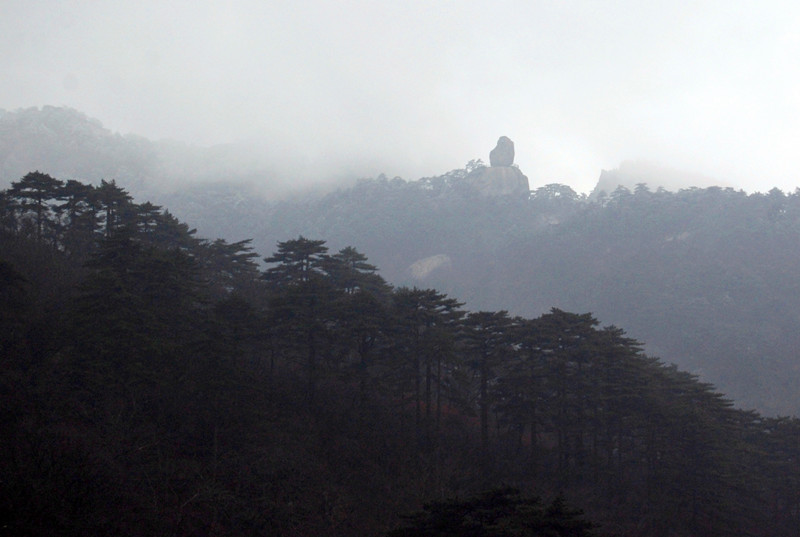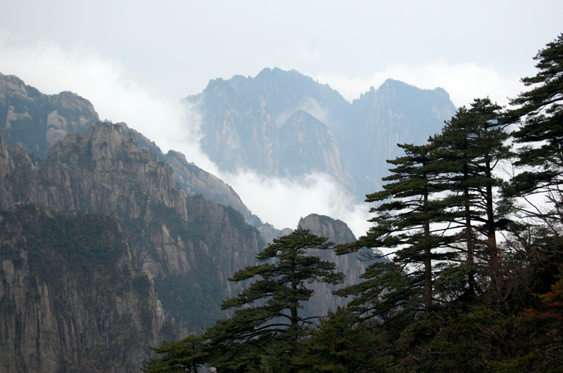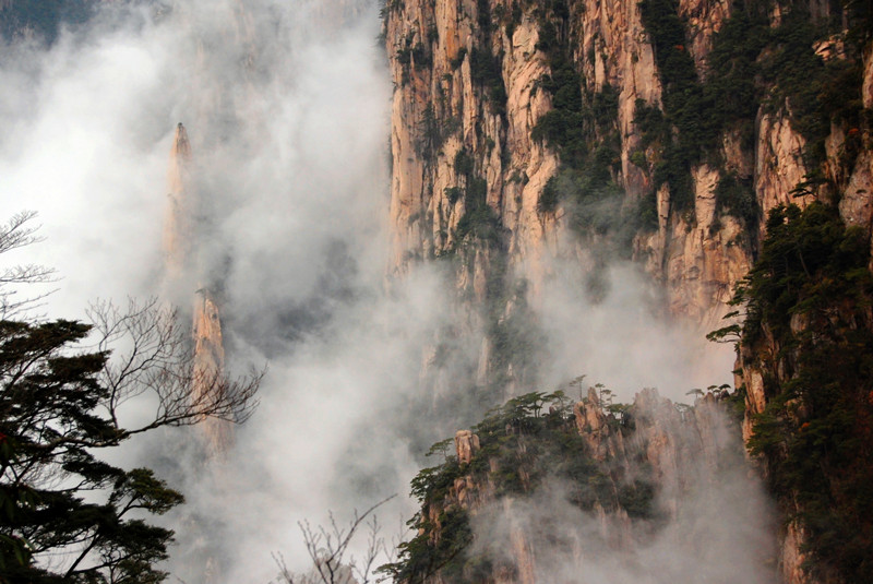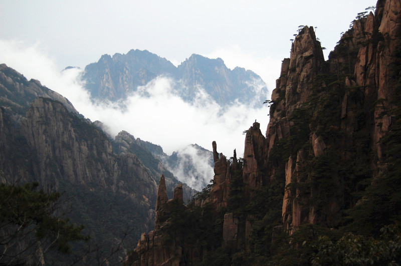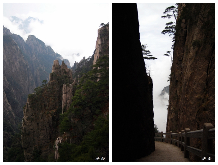 第一天上到山上时已傍晚时分,北海宾馆确定住宿后就赶紧奔往排云亭以期看日落,结果下午还阳光明媚的天突然就变成了大雾,浓厚得能够感受到扑面的丝丝水气,能见度只有3米左右,记忆中见过的最浓的雾了。入夜又下起小雨,尽管日出也不乐观,还是定了闹钟,第二天5点爬起来去狮子峰等日出,3月末的黄山在这样的天气里还挺冷的,需要抓绒+冲锋的装备配置。依然是浓雾弥漫,天慢慢灰白起来,却根本连太阳在哪都看不到。美景也需要缘分成全啊。罢,出发,西海峡谷!