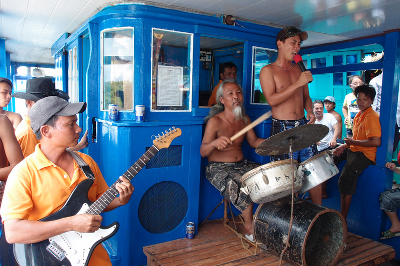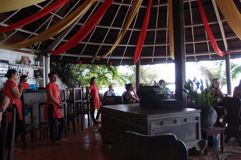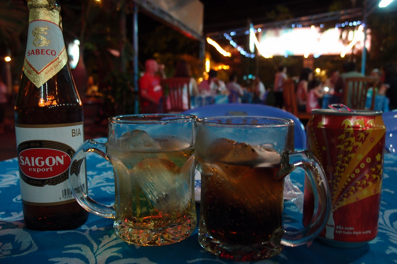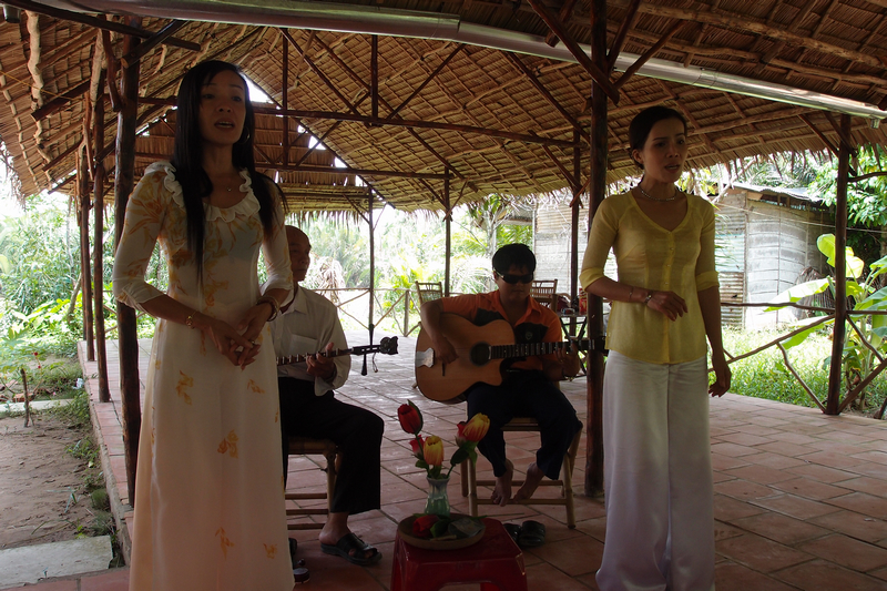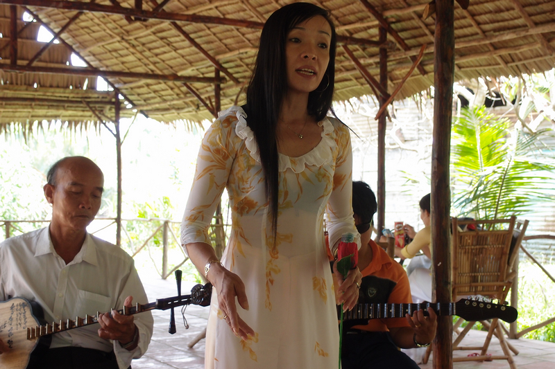 下面开始演唱越南 哀怨小调,音律回转之处让人心里不舒服。我确实不爱听的。她面前的花,对越南 有了解的一对移民美国 的越裔夫妇比较懂。他们那了花,把小费卷起放进花蕊里献给演唱者。这样做挺得体的。可是我们没有能学来,其他人是等演唱完毕后相继把钱放到托盘上。我们给的是20,000。