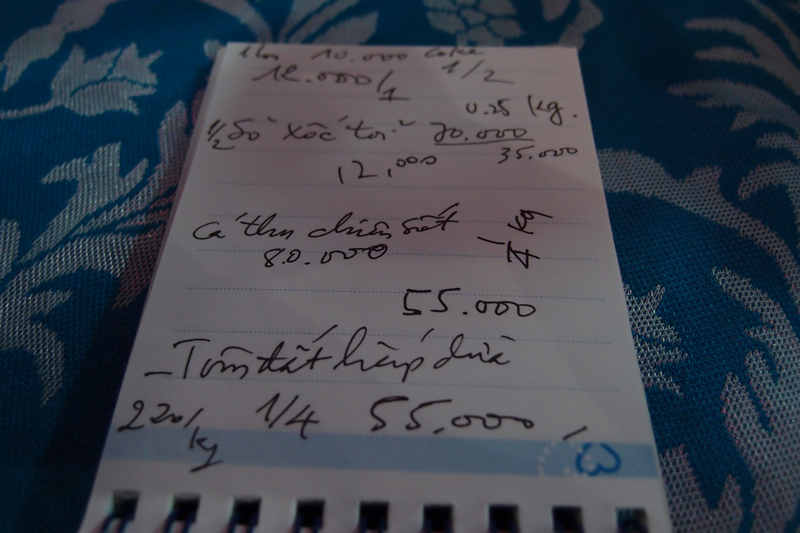 我们跟店家点菜沟通时所写。。。说得好辛苦啊,比如 我们要半斤虾,跟老板手舞足蹈地说半天,他终于明白,我们要1/4kg的虾,呵呵。不过有些东西上过来的也不是我们想要的,比如 我们要点通心菜,他们给了芥菜。。。