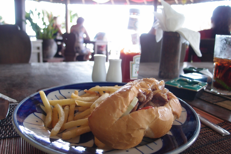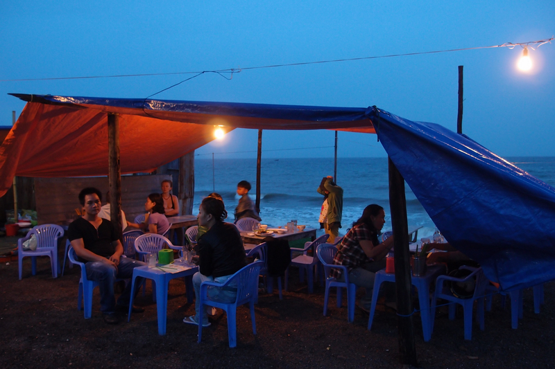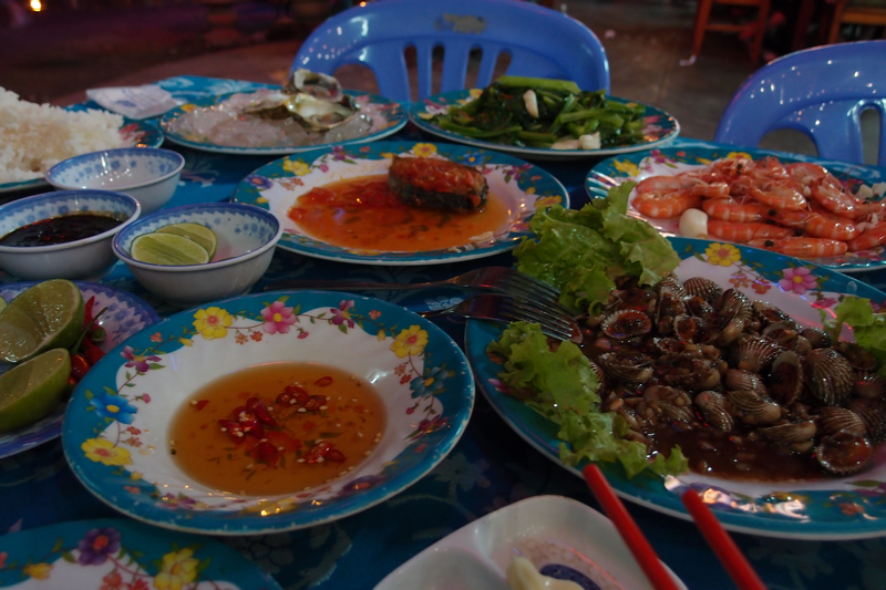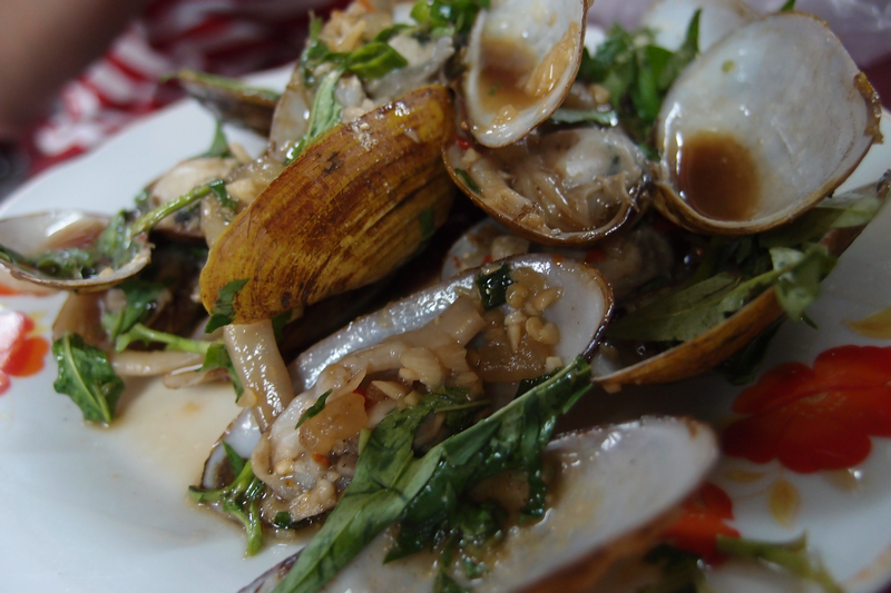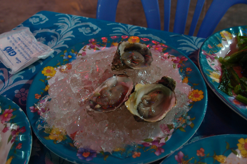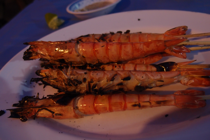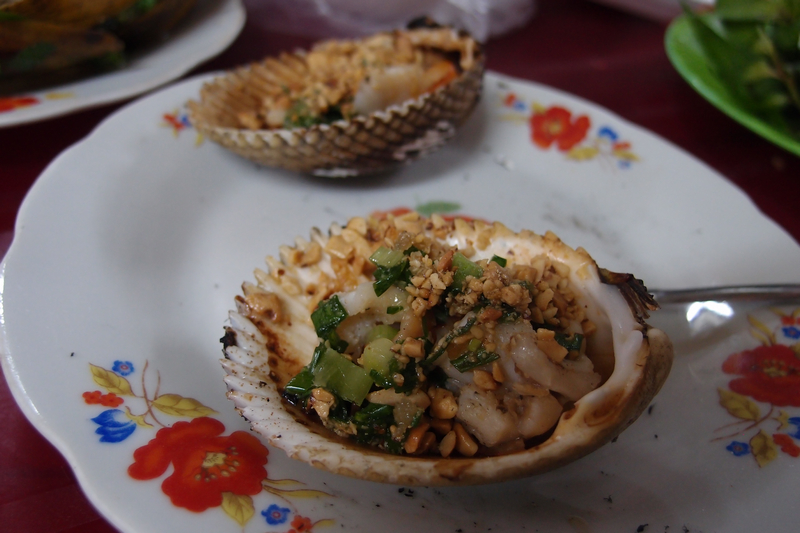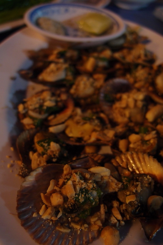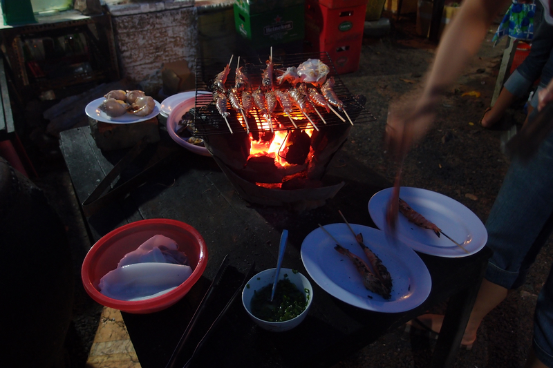 在../travel-scenic-spot/mafengwo/16102.html(芽庄 ) 的海里畅快玩耍以后,打算觅食。之前看别人的介绍,有80人民币一斤的大龙虾,68一大盘的海鲜烧烤杂烩,,,看得我那个口水流啊,非常想找来吃,,,可是特意加多半升油打算摩托../travel-scenic-spot/mafengwo/17296.html(开远 ) 一 些去找,还是没能发现。据说在blue star酒店对面,可是茫茫酒店海,,,找不到blue star。最后在人气看着很不错的一家叫"Gia "的路边大排档里落座,跟非常有耐心也挺好说话的老板沟通了半天,用笔用body language说了10分钟,终于下好单了。虾是220000一公斤,我们让老板给我们四分一公斤,再要了一份生蚝——我不知道真 的是生上的,,,不习惯吃 生冷的海鲜,结果没吃上。。。一份不知明的小贝壳,一份蔬菜,一份香煎吞拿鱼,加上米饭和饮料,总共320000。当然没有传说中的烧烤店好,不过也吃得 蛮开心。