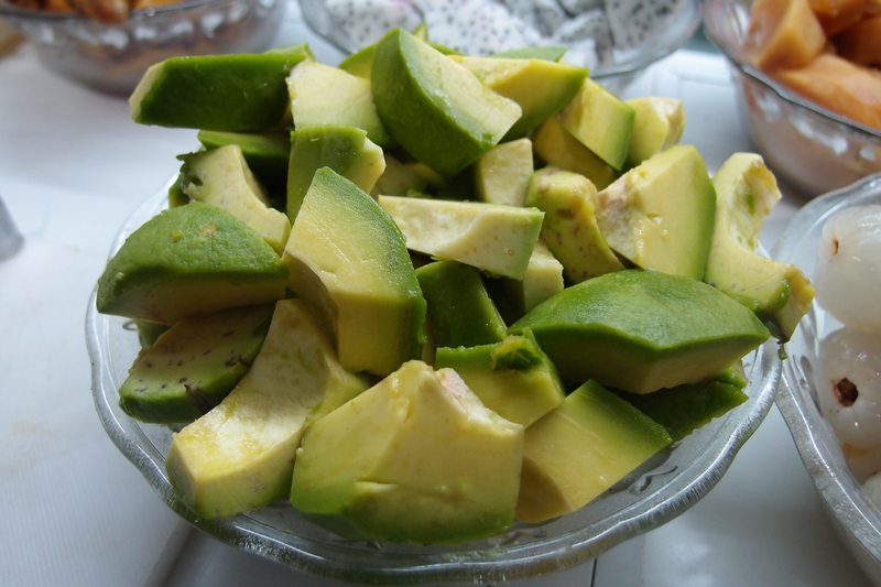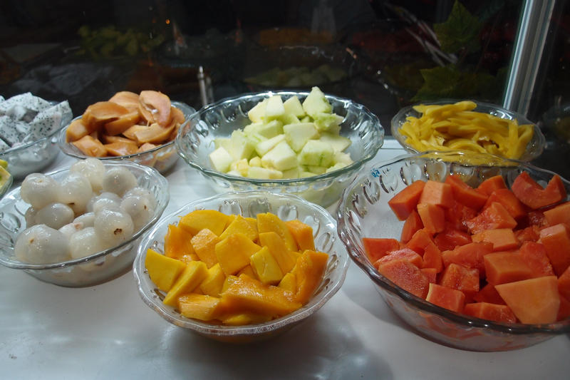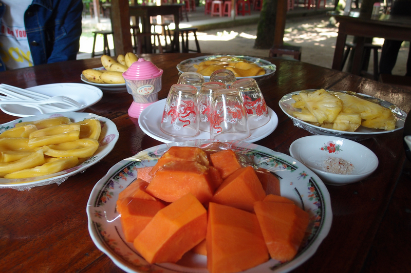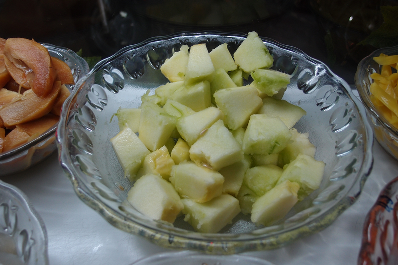 请我们品尝新鲜的水果,我很爱中间的那盘椰丝