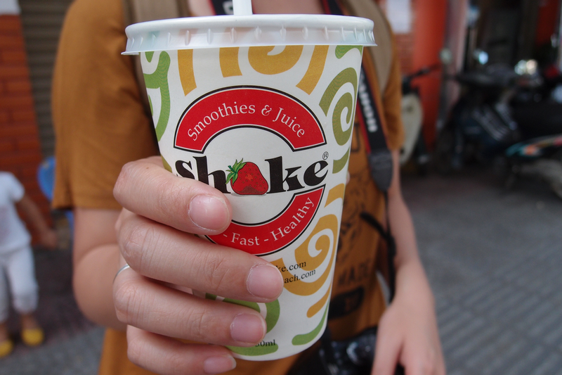 午餐完毕,开了一个半小时左右的车去到一个叫Vinh long market的地方,要买的东西已经买好了,感觉没有多大意思,我们三个都决定在停车处旁边的小店坐一坐就好了。其他人也大都如此。学着别人要了杯绿油油的果汁,搞不懂到底是啥,问服务生,他们也没法说出来。