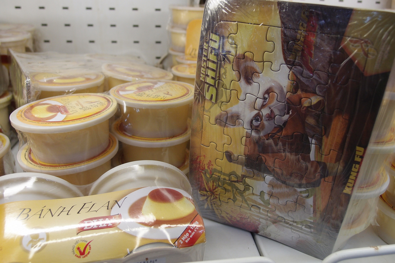 接下来便是出门觅食。我们首先来到街对面的一个大型超市。哇,功夫熊猫的师傅啊,跑来卖布丁了咧。我们支持了他一下,买了一盒回去。感觉挺好吃哟。