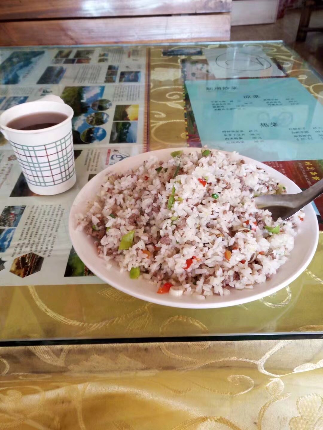 收拾好东西,出去吃饭,棒棒,看菜单不说话,点了一个炒饭,饭店老板上饭时很好心地把饭勺放在手心里搓了搓上面的灰,“别”字还没喊出口饭勺插在炒饭里了。吃饭的时候一个大叔问我“从哪里来”,我说“东土大唐,哦,不是,成都来的”大叔给我说他是开出租的,忙着吃饭,回个“哦”。大叔给我舔茶,茶挺好喝的,甜甜的,问什么茶,大叔说“da茶”,“什么茶”,“da茶”。“哦,打茶”,回到青旅问,原来叫“大茶”。餐厅老板像是个穆斯林人,大大的脑袋上戴着小小的帽子,我很好奇帽子为什么不会掉,讯问了老板和出 租车 大叔郎木寺到兰州的班车,发现自己赶不上兰州到成都的火车,另做打算。
