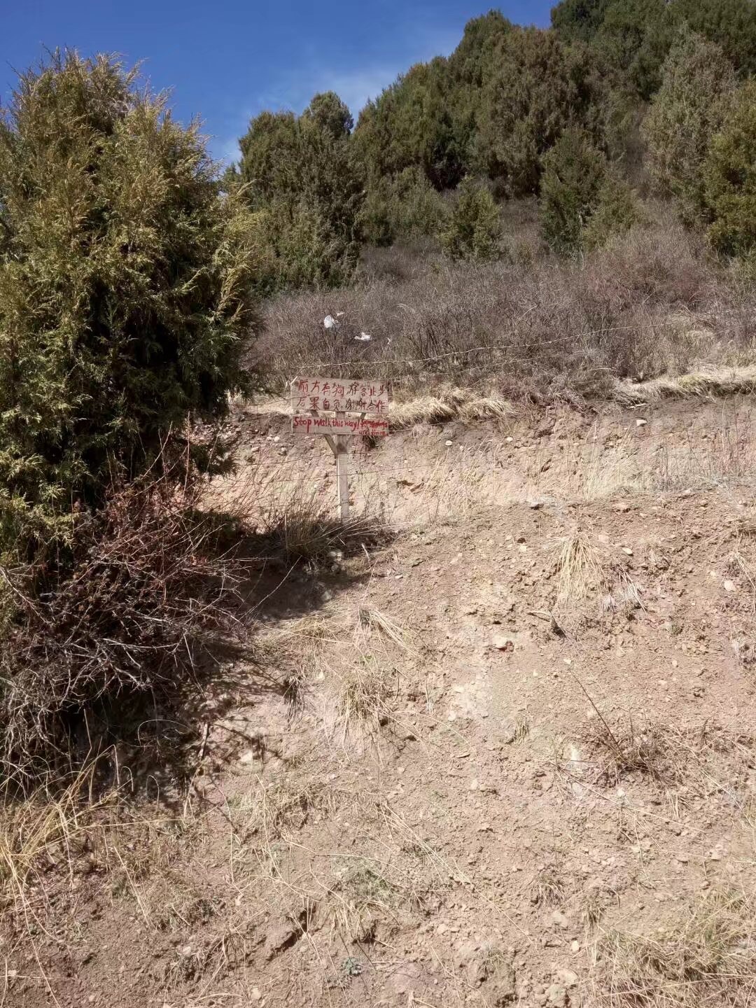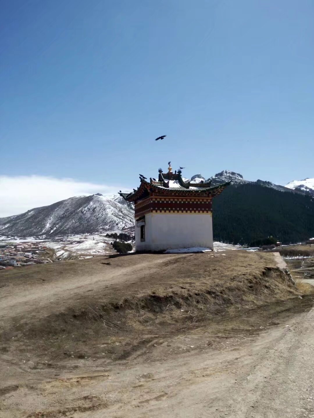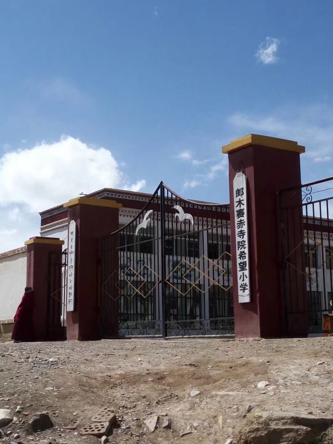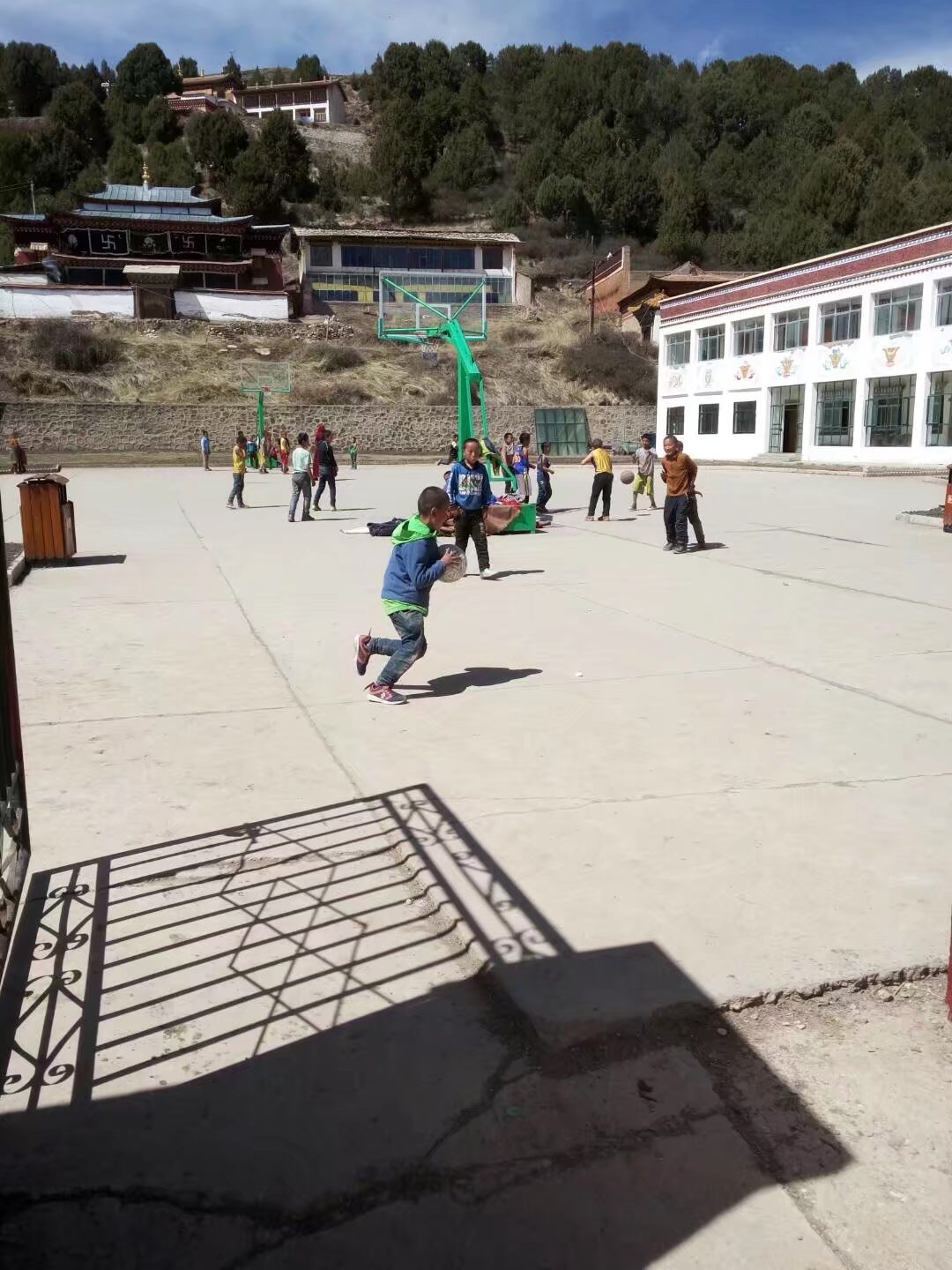 郎木寺最出名的是天葬台,瞎摸着走,找了条自以为感觉正确的路,走到一半被小僧人告知方向完全相反。找来百度地图解救,到了分叉路口,一位藏族卓玛给我说分叉路走错了,当时我在半山腰,卓玛在山脚下,给我指了五遍。去天葬台的路上路过郎木寺希望小学,碰到正在打篮球的小学生,发现他们手里拿着足球当篮球打,想把糖全部送给他们,脚踏出第一步就被撵了出来,不准接触。