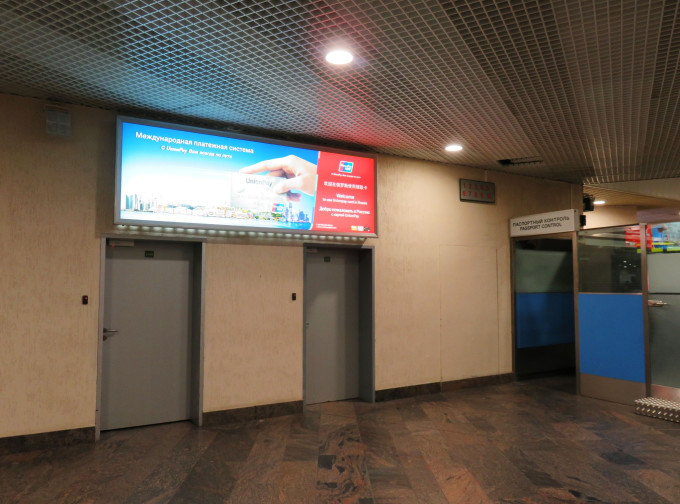 专门辟出的中国游客入关通道——墙上挂着刷银联卡的广告