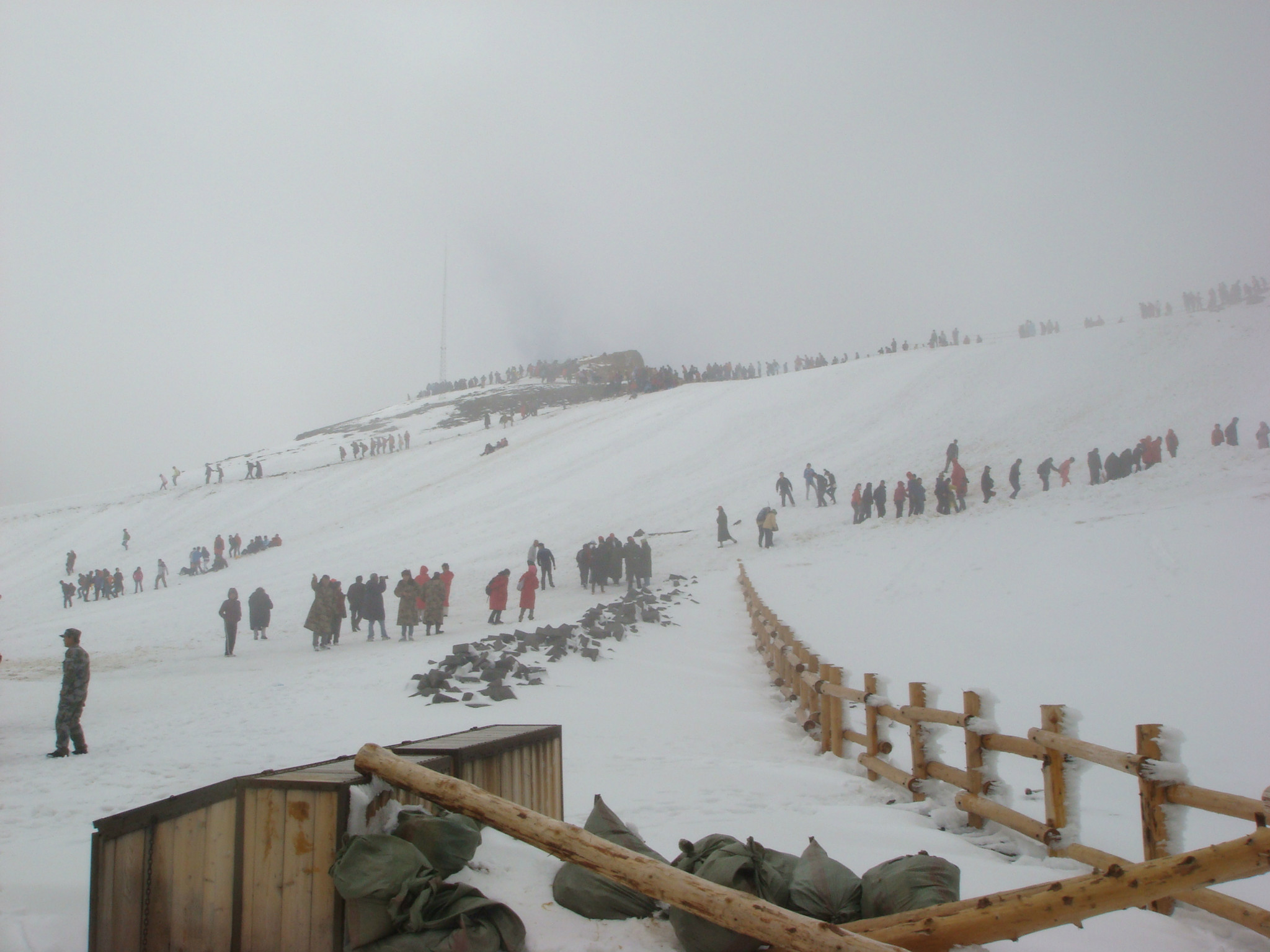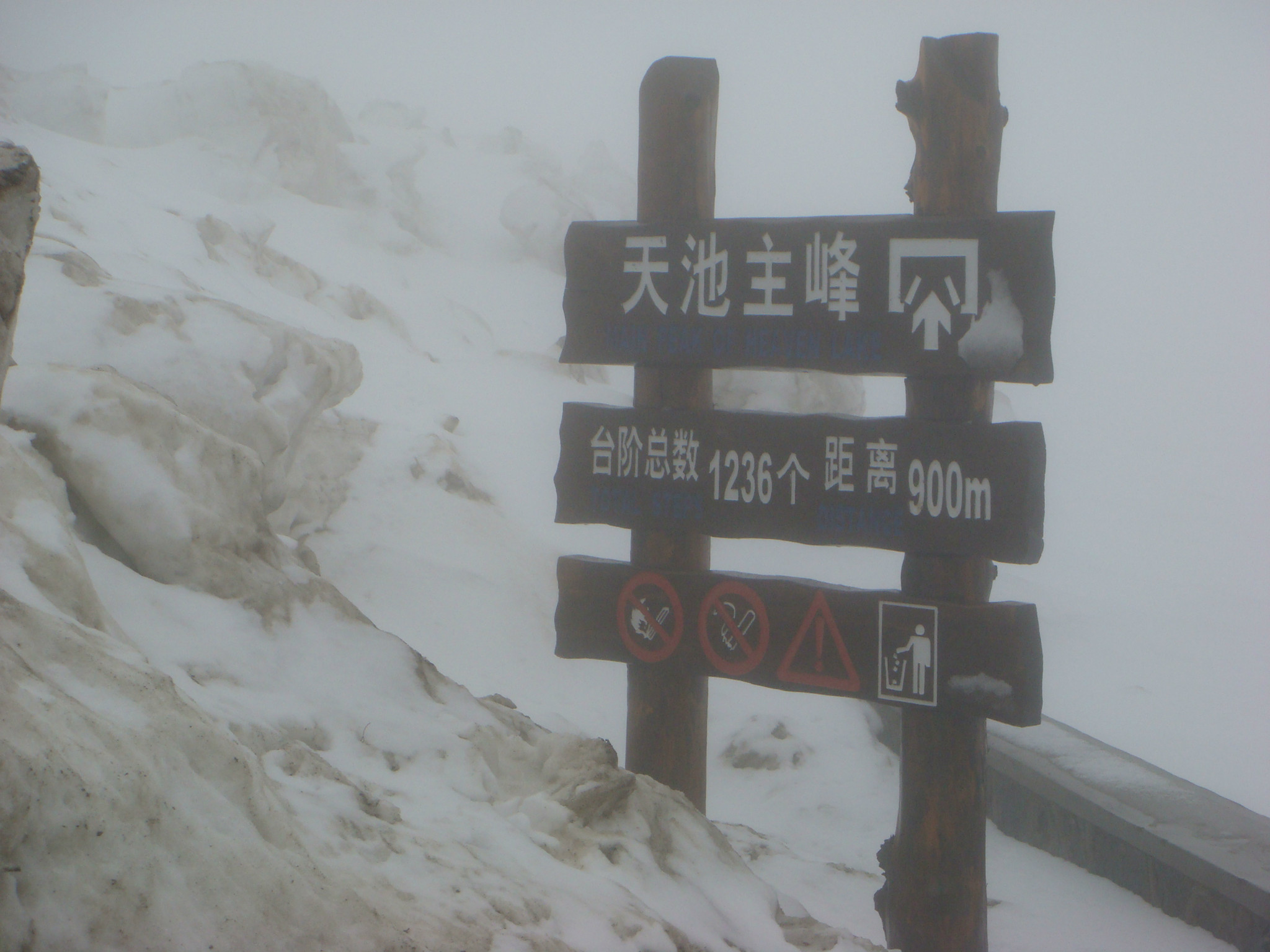 在山下的时候虽然阴天呀,有雾呀,小风凉飕飕的呀,但是谁也也都没想到上天池之后直接给我们从6月份打回到了腊月。坐在环保车上,看着路边的标识牌,随海拔一直在升高,植被也不停的变换,阔叶林-针叶林-光秃秃的高山花园-苔藓地带,坐在车上也越来越来冷,开始觉得冻手了,呼出的气也越来越白,车窗开始哈气,慢慢的路边开始出现残雪,然后大片的薄雪,突然一个转弯路边出现了一堵一米多高的雪墙,顺着山路越往上走雪墙就越厚。这还不是最刺激的,到山上服务站的时候,外面已经是白茫茫一片,大风吹起早上下的新雪混着大雾或者是云层,3米外已经看不清楚了。地上是雪混着雪水加冰水,深一脚浅一脚的走到西坡上天池的楼梯口,往上看什么都看不到就是一片白茫茫。有几个想试着上天池的中途折返回来的人从雾里走出来,还真有点天外来客的感觉。因为太危险了,导游建议我们返回,明天上北坡的时候再上天池。很遗憾的说,不过也没办法。