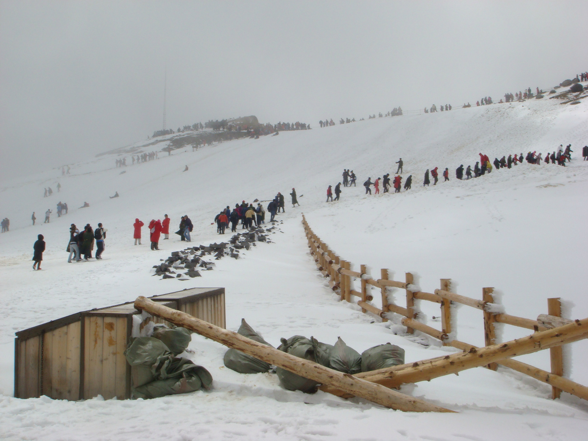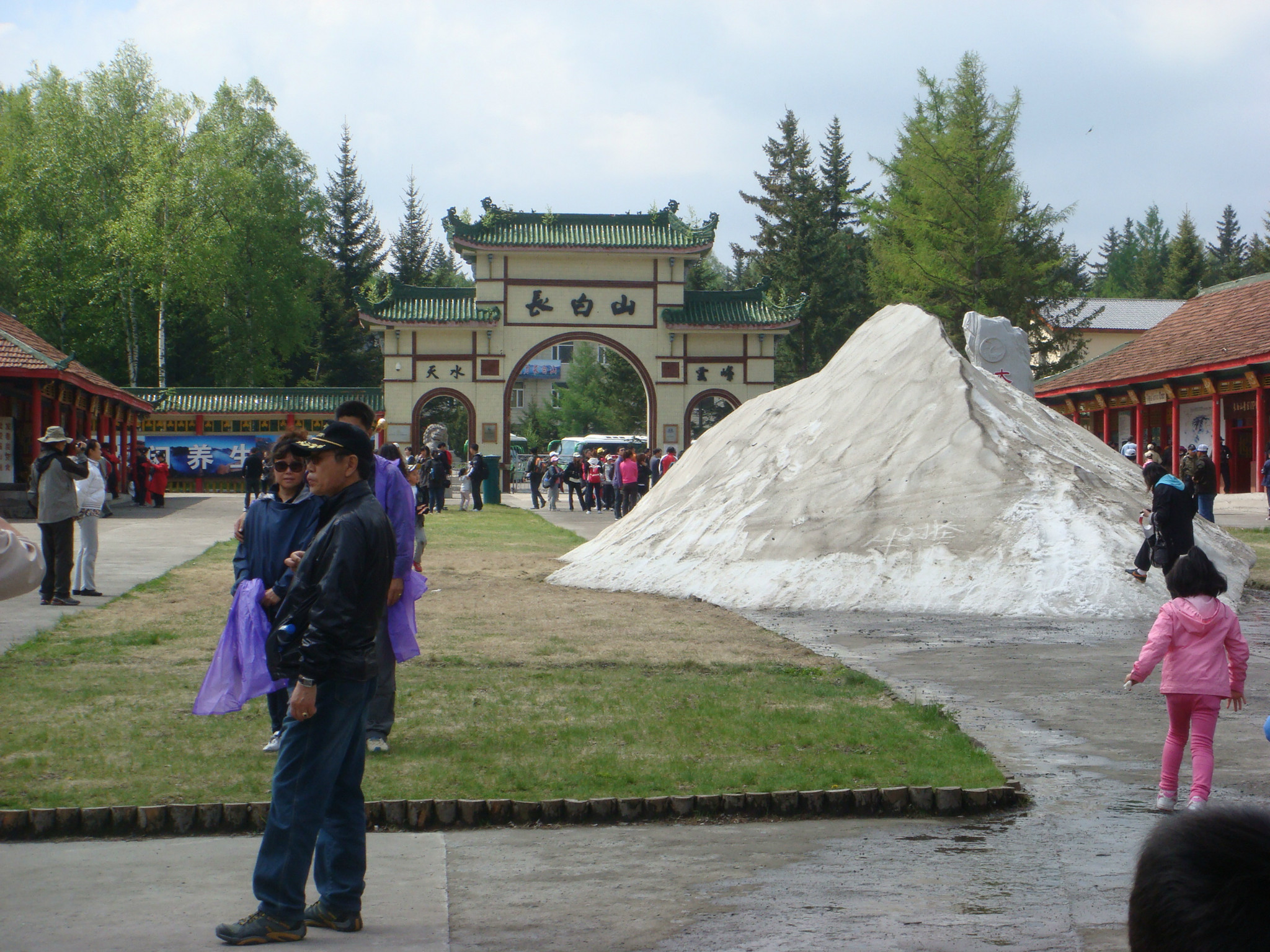 第一天我们的行程是上西坡,从朝阳镇-西坡山门,用了将近3个半小时的车程,中途还找了个镇子吃早饭。大家一致反映小米粥很香,是城里吃不到的。在镇子上的时候还是天空晴朗,越往山上开天就越阴,雾气越来越大。到了西坡山门外的停车场,下车迎面的就是4、5米高的一个巨型大雪堆,顿时“哇”声一片,紧接是着相机响成一片。不过导游带来了一个不好的消息,早上山下下的是雨,但素山上下的是大雪,现在还没停,能不能上天池要等调度通知了。导游建议我们去租件大衣,以防上边冷。因为下雪生意好做,租大衣的商家看我们20几个人都想租,立马涨价,原本30的涨到50。愤怒鸟。。。。这里也提醒想要在6月中旬前上山的tx,衣服要带够,推荐冲锋衣衬厚抓绒。上山的时候没有经验,只穿了件薄的训练衫,幸亏是高领的,最万幸的就是我穿上防风服了,很起作用的。