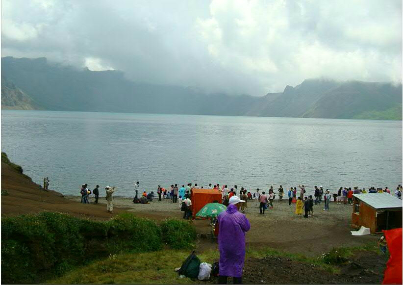 终于是到了天池边上了,人山人海熙熙攘攘,围着山崖边站的是里三层外三层的,山顶没有太阳,凉风阵阵拿相机的手一会就冻的通红的。雾很大也很厚,也许不是雾是云层,反正就厚厚的站在崖边上往下看什么也看不到,但是一阵风过来,风吹开雾吹开云的一瞬间天池就露出来了。说实话但看天池有点小失望的,就是一坨大冰块,不仔细看还以为水干了看见是池底呐。但是因为他藏在厚厚的云雾里,要等呀,也许等也看不到呀,就像我们在西坡一样,所有看到了会很激动,太阳照在那坨大冰上闪着光。每次云雾一散就是一阵的啊/啊/啊的惊呼,各种相机咔咔咔不停。