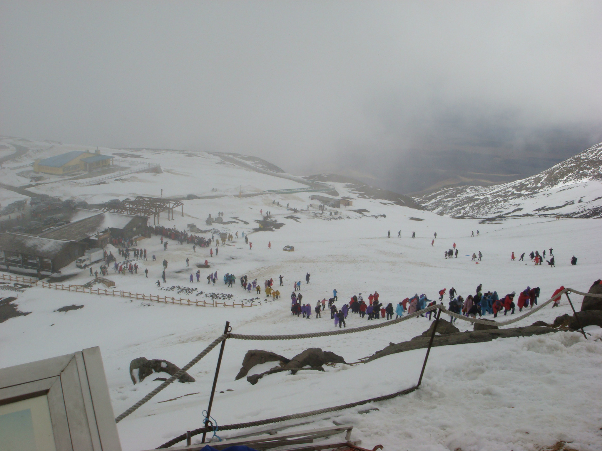 各种围观各种合影之后下去换倒站车,上山难下山也难,有人用租来的棉衣垫着直接从坡顶滑下来,我还是走下去的,雪很深,厚的地方没膝深,看不到路,一路连滚带爬,连摔带坐的下了山。再次回到服务站的时候天空晴朗阳光明媚,有点时空错乱的感觉,不敢相信刚才那冰天雪地是真的。