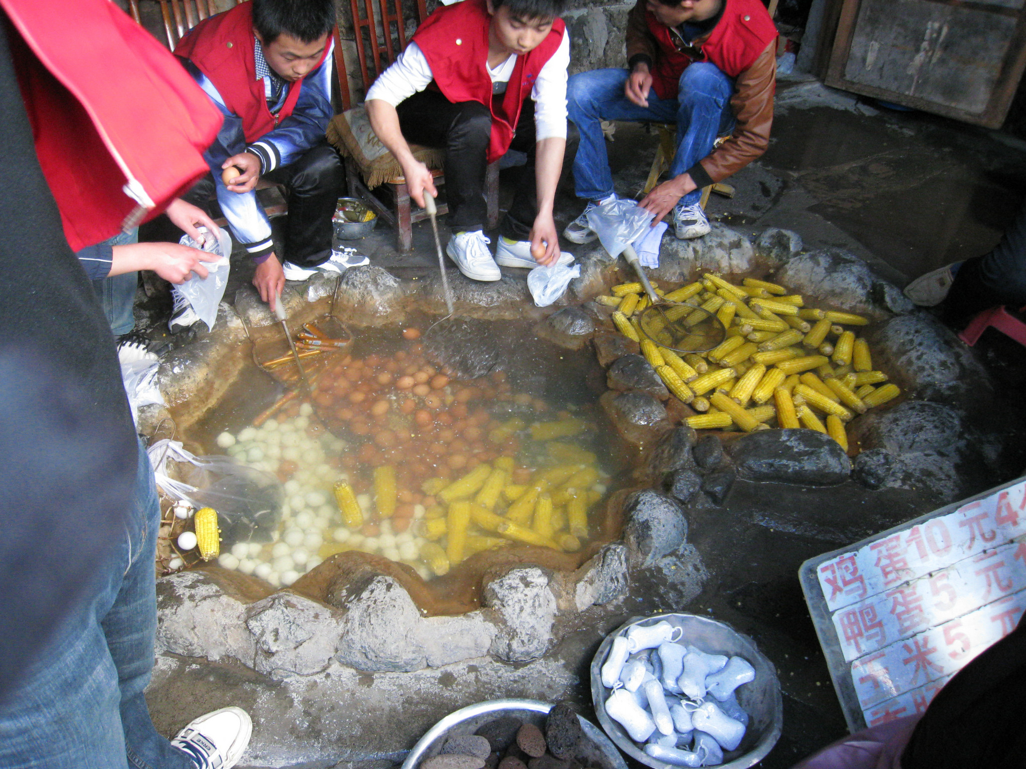 温泉鸡蛋,玉米加火腿肠,其实是在别的温泉口煮差不多了再放到这里边加温边卖