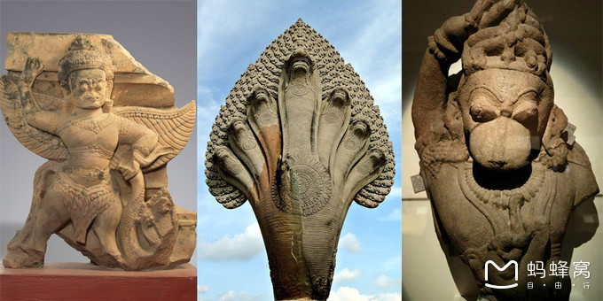 有着金色的大翅膀,是鸟类之王,也是毗湿奴的坐骑,也许一般会把这两者联想在一起,不过在柬埔寨,它也成为了独立的信仰对象。在寺庙里,它往往出现在栏杆上,要不就是巨大的雕像