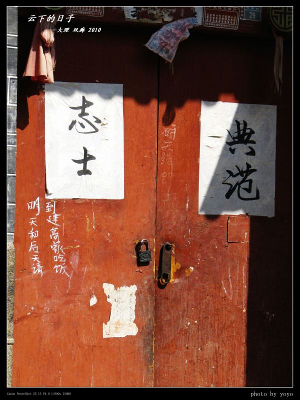 其实,双廊的白族人家多是高大带飞檐的门楼,白墙上多书“彩云南现”“风花雪月”之类的字。狭小的巷子是常态,巷尽头便望得见洱海。高低的光影里有绿植绕 墙,蛛网扶壁。我和KOKO在小镇上执手游荡,太阳明晃晃的亮。说起来这一行本来想去的地方不少,才村,喜洲,挖色,和顺。。最后还是沉溺在了双廊的慵懒 里。况且谁叫吾辈不像可乐那厮般是有钱又有闲的主,从初一我们同下飞机起到现在我都回来蜗居数日了,他娃如今还不知行走在老挝哪城哪街上。