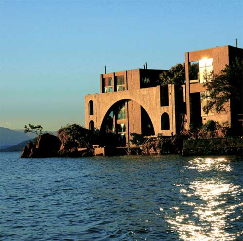 这次没能坐上白族渔船出海,没能见到青庐和太阳宫月亮宫的全貌,所以借用其他网友的PP来看图说话。没有对比无所谓差距,所以只有看过高手们的作品,你才 能明白,摄影就是种幻觉,我模模糊糊的喜欢这种幻觉。赵青的青色大屋于岩间端然兀立,草木、岩石、砖瓦、不锈钢和玻璃,为小岛砌出一幅妥贴的后现代颜面。 微微退后的弧线处是他给杨丽萍设计的别墅,小巧的月洞门下便是直上房间的水阶,含蓄如树间水鸟的小巢。青庐巨大的拱廊简化为仪式般的月洞牌楼,正对着西面 的苍山洱海,轩朗吐纳的气象中有天地庄严。月拱下的私家码头如船埠,又像吊桥已卸的城门,张扬后隐含恭俭自重的待客之礼。