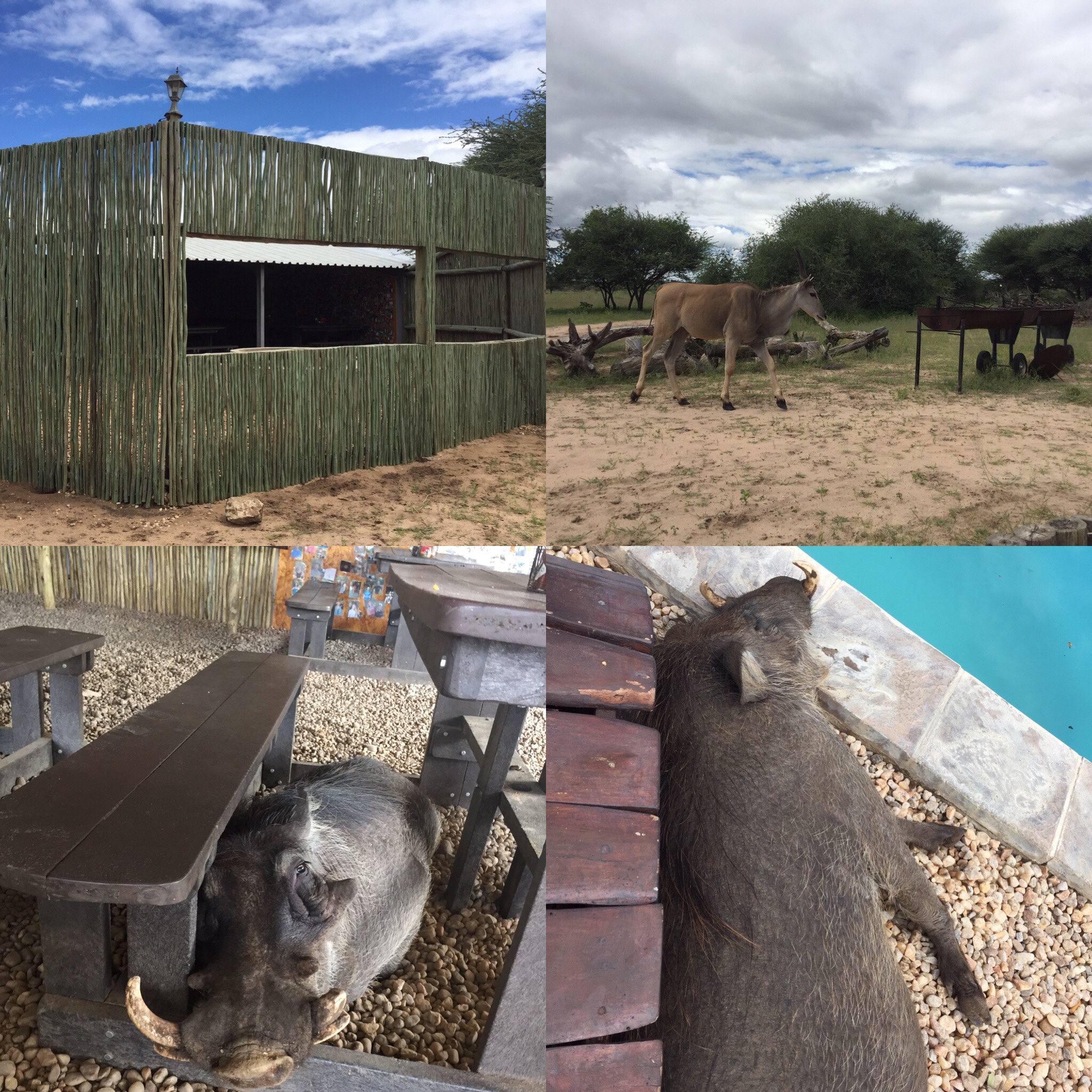 吃饭的地方叫lapa,经常吃着饭一抬头,看到野猪,羚羊,运气好还能看到斑马和长颈鹿,简直太兴奋。这只叫培根的野猪非常亲人,在餐厅,在小木屋他老是哼哼哼哼的追的好多志愿者哇哇乱叫。harnas给野猪起名的冷幽默:几只野猪分别叫培根、火腿、开心乐园餐。不知野猪知道了心里怎么想。哈哈哈。