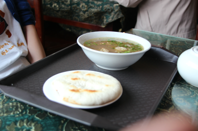 早上8点,史师傅已经早早的就到客栈门口等我们了,车子里里外外都打扫的干干净净,(相比之下我们家那车真的脏的狗窝都不如呀!)我们问了一下,当地人早上都喜欢吃一种叫羊杂碎的东西。史师傅把我们带到一家当地人喜欢吃的店,店里生意很好,全是些本地人在吃。店里面很干净,两个戴小白帽的回族大叔在柜台里现做现卖,很热情!汤很好喝,就是西宁 这边的人吃东西都偏咸,我一上午都在找水喝!
