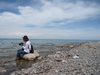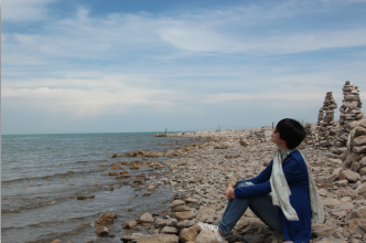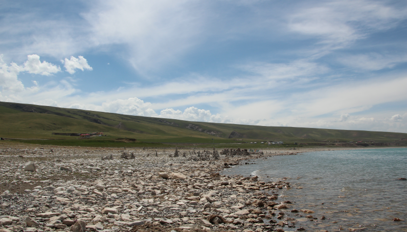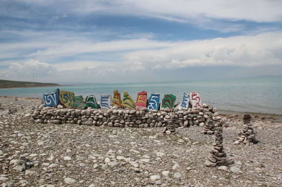 到了中午天空越来越蓝,白云不断的变化出各种形态,美的让人目不暇接。我们吃过午饭终于到了湖边。中午的湖看起来像是白色的,却泛着蓝光。空气里湿湿的,一点也没有觉得像是在高原,它是那么的新鲜!轻轻的尝了一下,咸咸的!我的心也变的咸咸的!这是卓玛家 自己垒的尼玛堆!