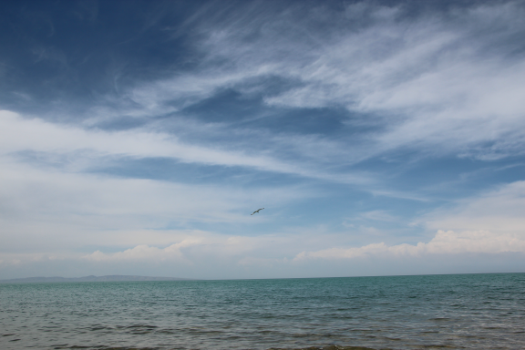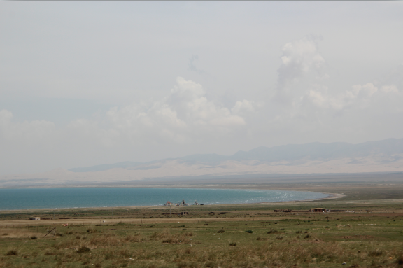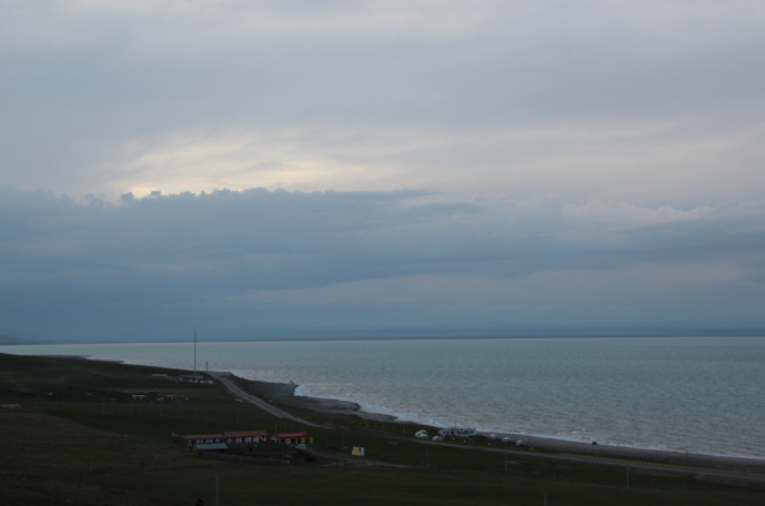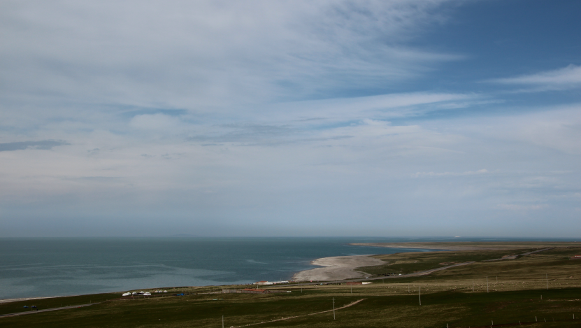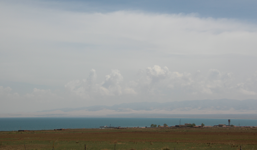 天慢慢的放晴了,很明显的感觉到云很近,仿佛触手可及。蓝蓝的天上白云飘,白云底下马儿跑,这歌词真是写的棒极了!很快,便从国道的右侧看到了青海湖 ,从远处看,那一抹蓝仿佛就挂在天上,它蓝的让人陶醉!史师傅说我们来的不是时候,这个季节不是青海 最美的时候。不过我觉得这就已经够让我满足了,留点遗憾,把它当成让自己下次再来的理由吧!