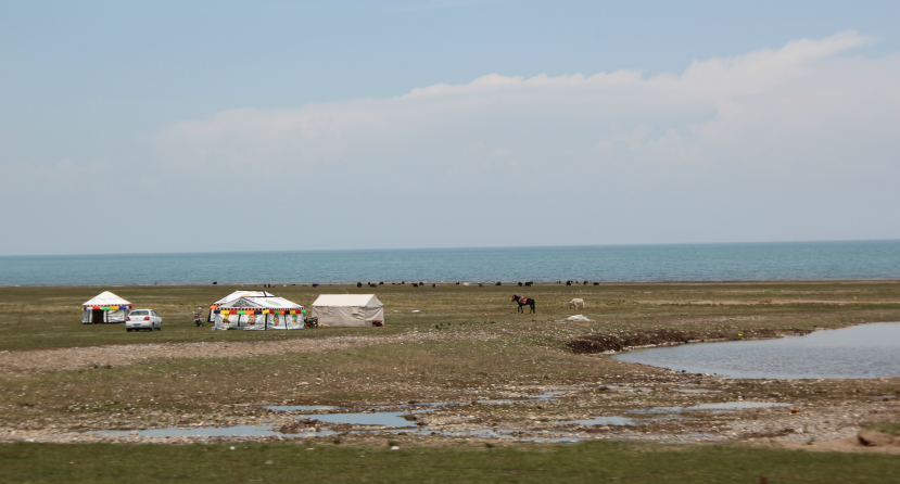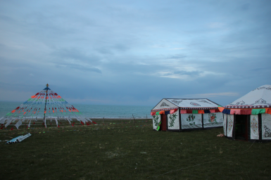 藏民家的帐篷,真正他们自己住的一般是白色或是黑色的,这种花帐篷是为了吸引游客的。在环湖路上一定要小心,不要轻易跨过公路踏上藏民家的草地或是菜地,就连“唱歌”(俗称小便)的时候都要小心。史师傅就曾经拉过一车客人,见四下没人,就下车唱歌,说是迟那时快,一个藏族同胞开着摩托车像从天上掉上来的一般呼啸而至,硬说这是他家的草地,要给50块。好在史师傅说他是塔尔寺的,并且拿出证件,藏族同胞(他们都信教)才肯放行!路边上很多小路可以直通湖边,可是不要妄图私自走到湖边,他们可都在某个角落潜伏着呢!以前好像是按车算,十块钱一个车,现在好像是按人头算。唉,真是价格疯长呀!