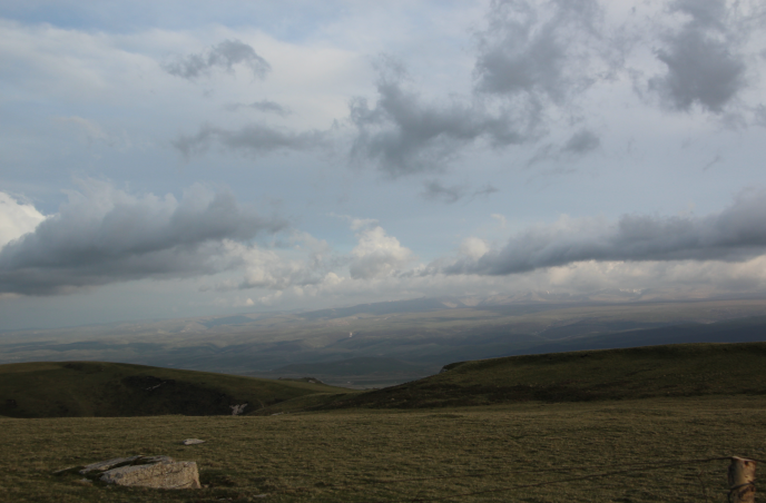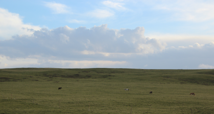 爬过一个山头,突然眼前变的非常的开阔,几匹马儿在悠闲的吃着草,天很低很低,云很近很近。眼前的这一切让我们兴奋不已!