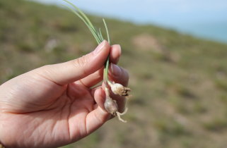 在爬山的路上我们一路走一路看,发现好多有趣的东西。史师傅又当向导又当解说员!这东西叫野葱,遍地都是。史师傅说他们青海 的牛羊肉之所以不膻就是因为它,我们挖了几颗来吃,比我们家里吃的葱要香很多呢!