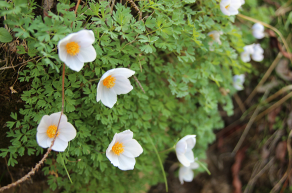 这种花不知道名字,都长在岩壁上,一丛一丛的,小小的白花,黄黄的花芯,再配上绿色的小叶,真是太美了。老弟大叫着想把它们移植到自家的阳台上!